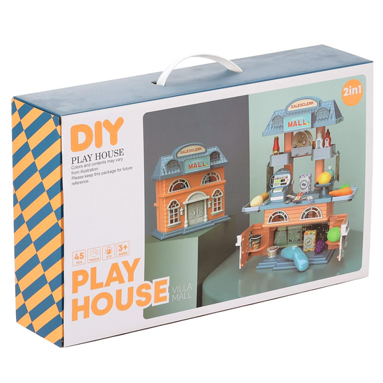 Transform playtime with this innovative 2-in-1 DIY Playhouse! This versatile toy starts as a charming residential "Villa" and unfolds into a bustling "Shopping Mall" complete with a sales counter and product shelves. With 45 pieces including a handheld scanner, various play food items, bottles, and detailed stickers, it offers an immersive role-play experience for kids aged 3 and up. It is designed to stimulate visual and tactile development while providing hours of fun.