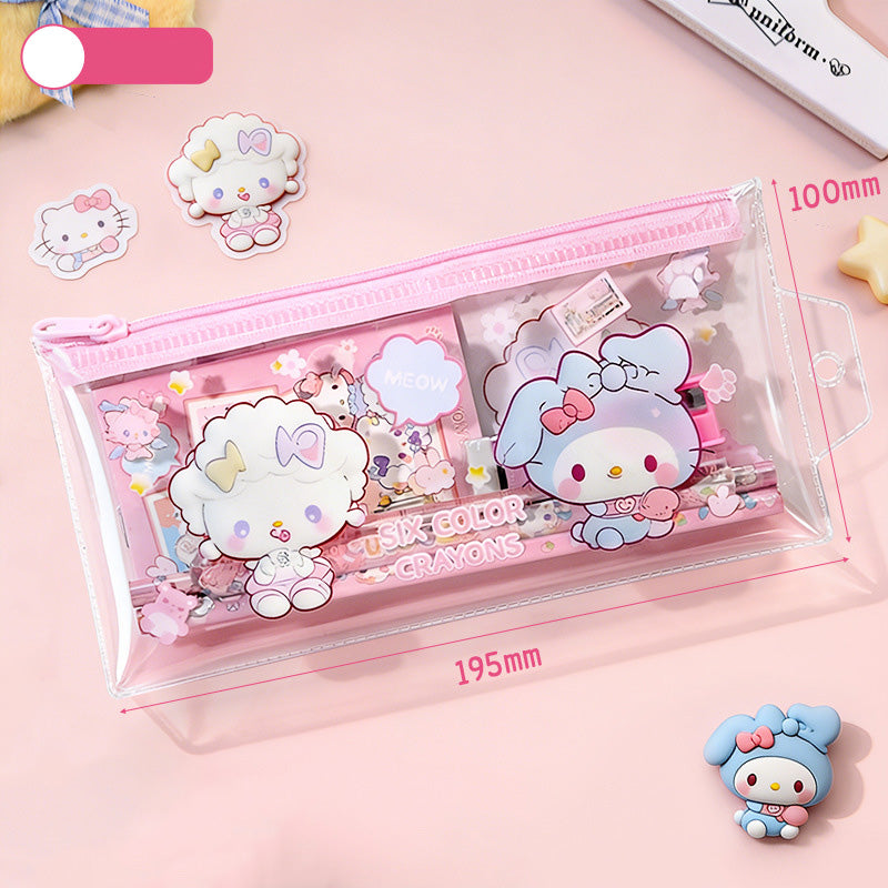 Package Includes: 1x Transparent Zipper Pouch, 2x Printed Pencils, 1x Character Ruler, 1x Eraser, 1x Sharpener, 1x Mini Notebook (Specific theme sent randomly from the assortment).
