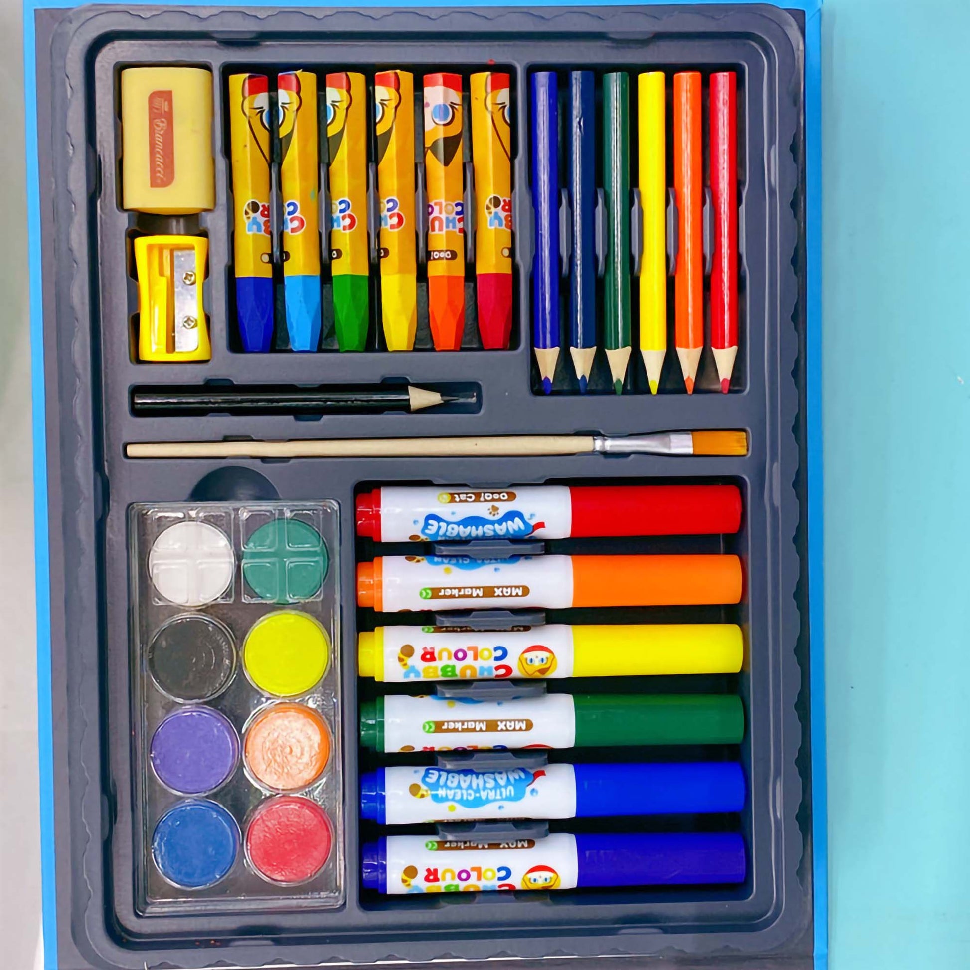 🎨 Complete 67-Piece Set: A fully stocked art studio containing 6 Washable Markers, 6 Color Pencils, 6 Oil Pastels, 8 Watercolor Paints, and 6 Peanut Crayons.