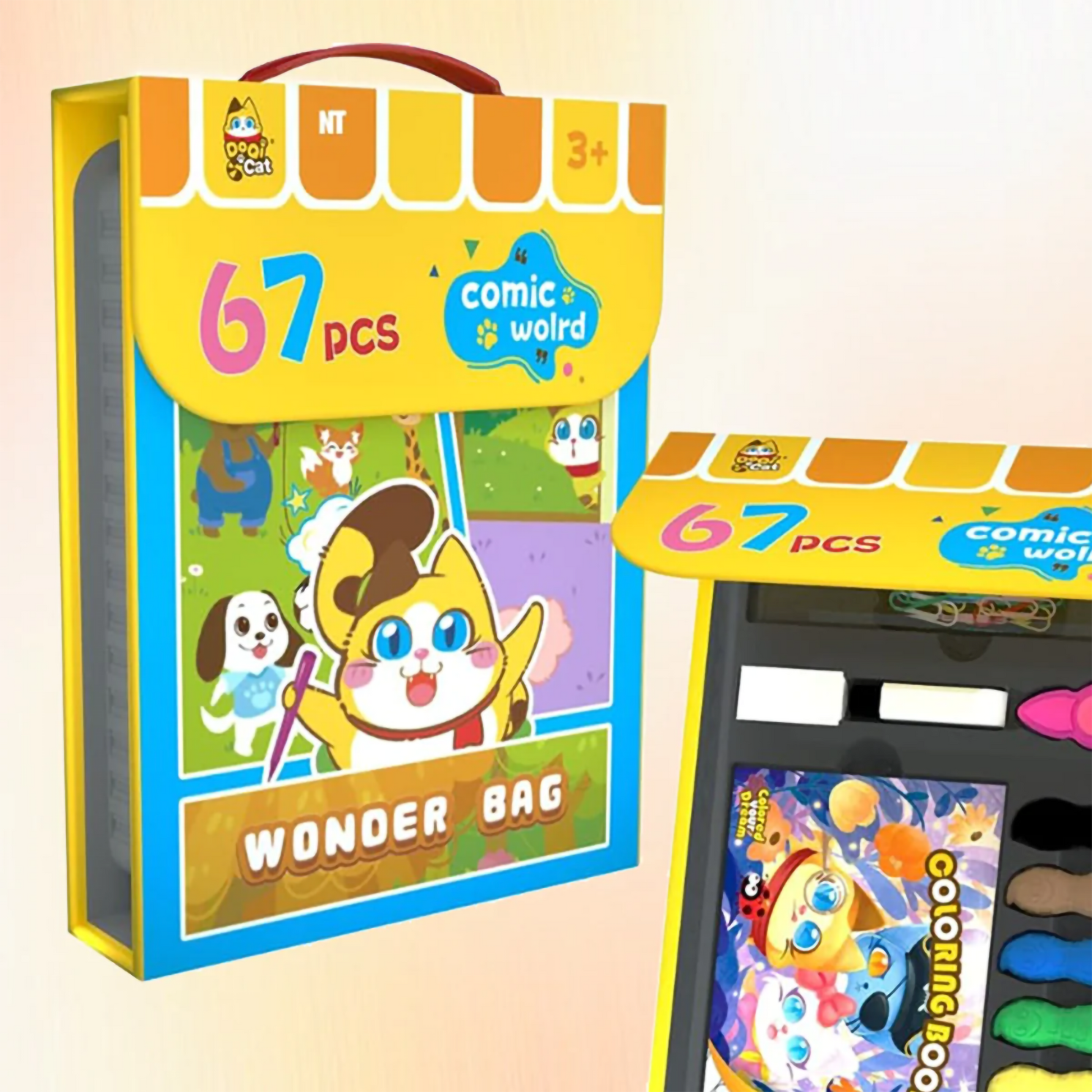 Spark creativity on the go with the Wonder Bag Art Set! This adorable 67-piece kit is designed as a portable "Wonder Bag" folder featuring the lovable Dool Cat and friends from "Comic World". Unlike standard boxes, this set opens up like a portfolio to reveal a treasure trove of art supplies, including unique Peanut Crayons perfectly shaped for little hands. With a built-in coloring comic book and a wide variety of tools, it's the perfect travel companion for young artists.