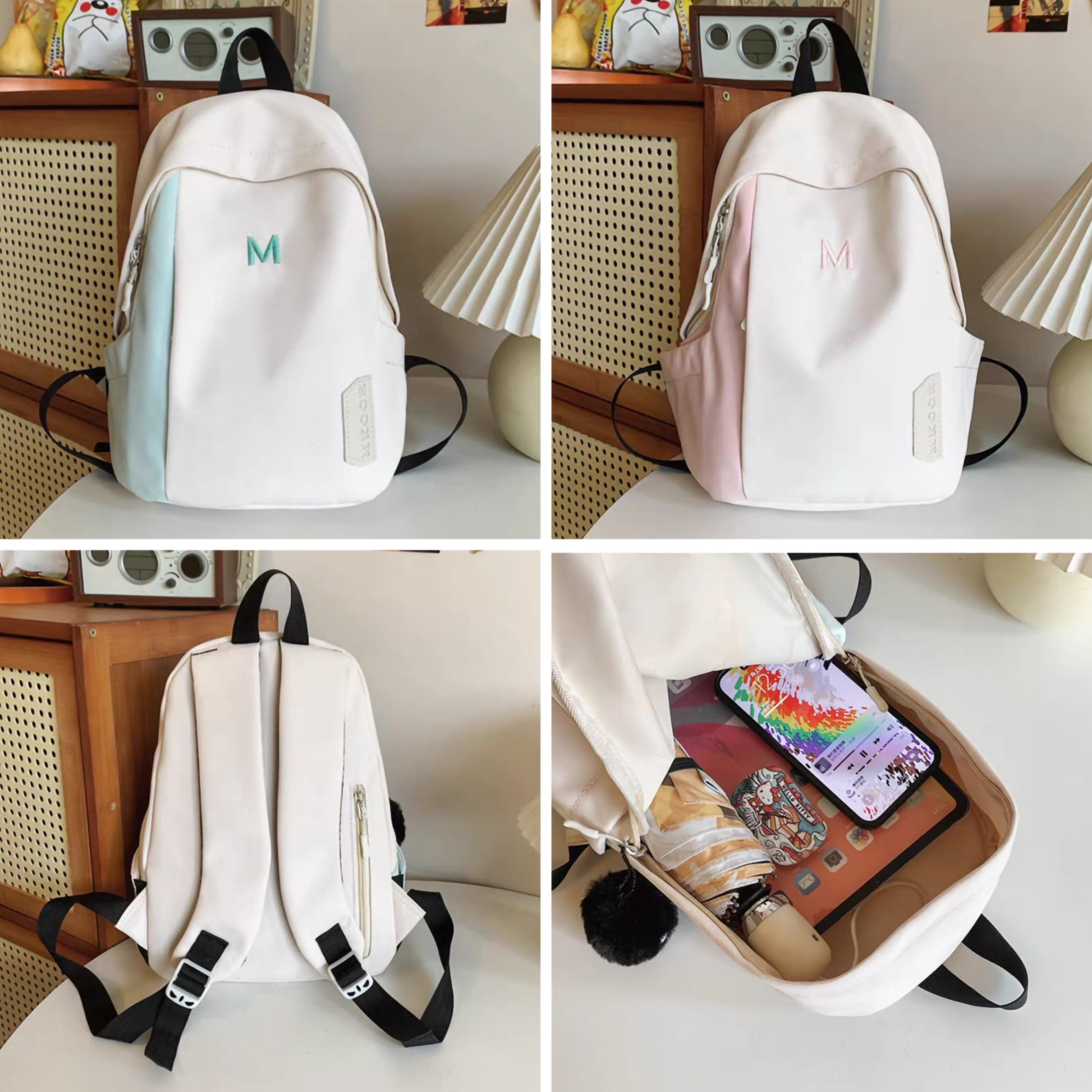 🎨 Color & Design: Off-white canvas base with color-blocked pastel side panels (Mint or Pink). Features a "MKCOH" patch and embroidered initial.