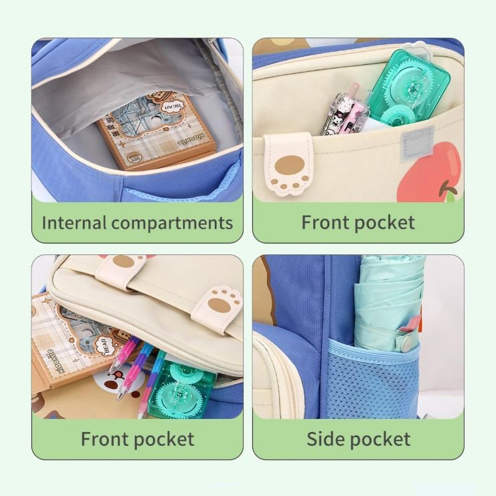 🗂️ Stylish Front Pocket: Features a handy front storage pouch accented with cute paw-print strap details and a playful apple or carrot graphic.