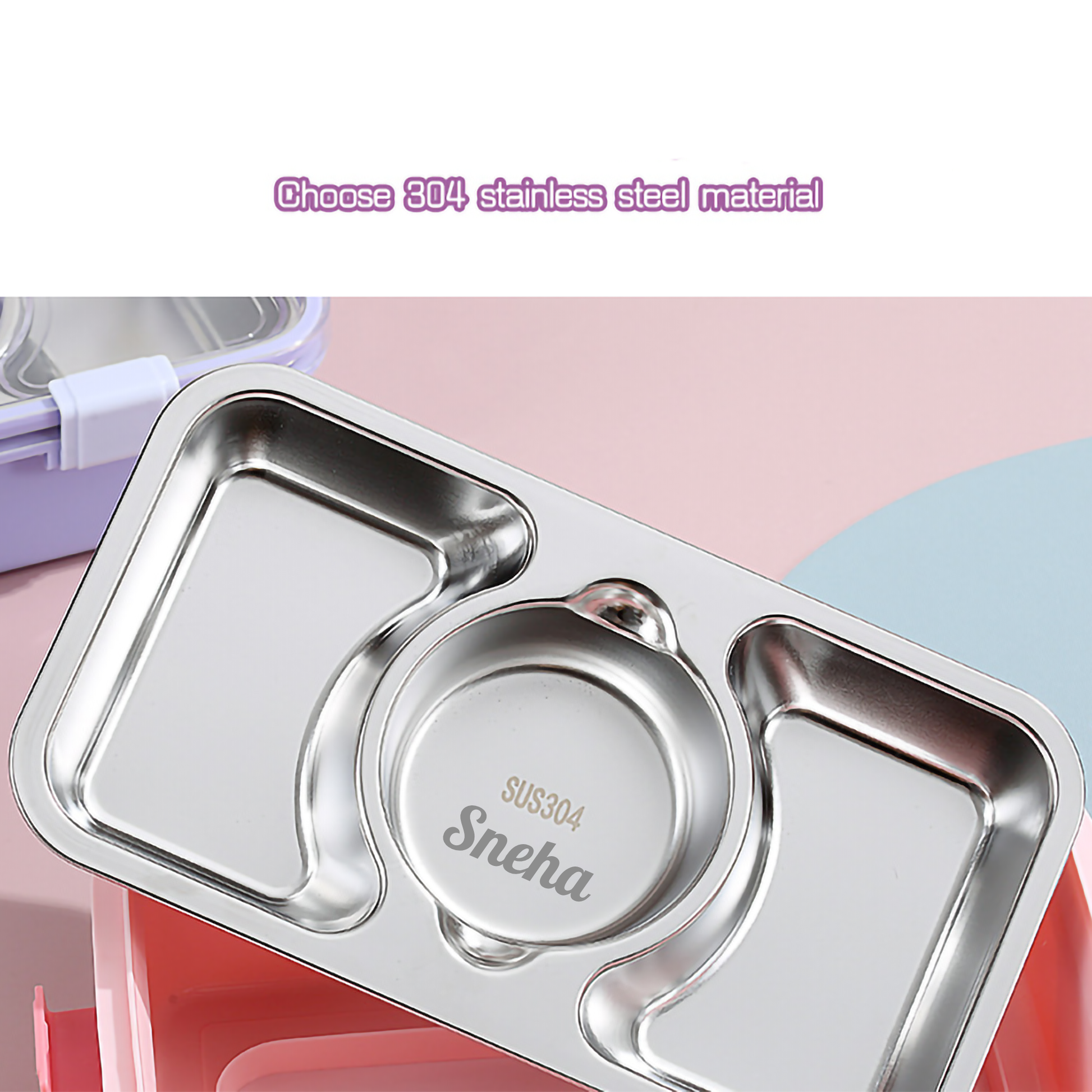 Make lunchtime delightful with our Bombay Bites Customized Stainless Steel Lunch Box with Name. Featuring a premium 3-compartment food-grade stainless steel interior and a dedicated center soup bowl, this personalized lunch box keeps school meals fresh, warm, and perfectly portioned. Its kid-friendly and highly practical design includes hidden cutlery storage and a water-heating base, while the custom name print ensures your child's favorite tiffin box always comes home safely.