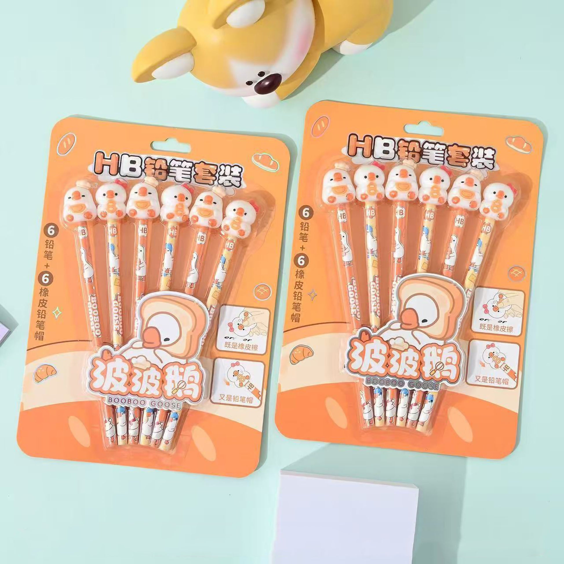Package Includes: 1 x Pack of 6 x Printed Wooden HB Pencils, 6 x Removable 3D Goose Eraser Caps (sealed in a blister pack).