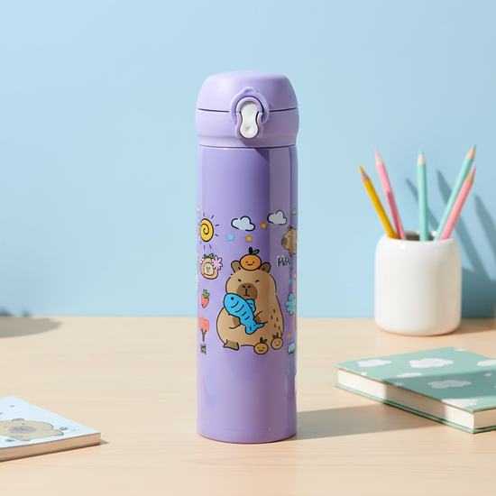 🦫 Adorable Capybara Design – Each bottle showcases playful capybara prints in pastel colors — Blue, Peach, Purple & Pink — loved by both kids and adults!