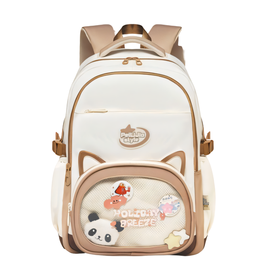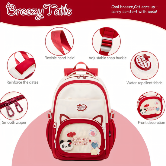 Add comfort and playful style to every school day with the adorable "Breezy Tails" kids school bag. Featuring cute cat ears, fun panda decorations, and a highly breathable back, this lightweight school backpack makes carrying daily essentials an absolute breeze. Built with water-repellent fabric, a handy luggage strap, and smart multi-pocket storage, it is a highly durable kids backpack that perfectly balances charm and practicality. Whether for daily classes or family travel, it is the ultimate student book bag!