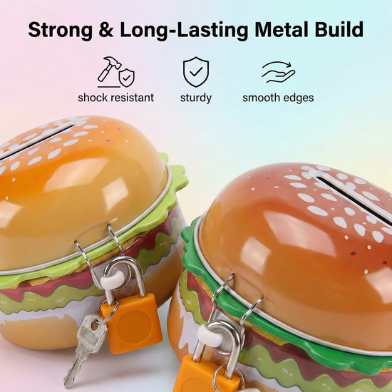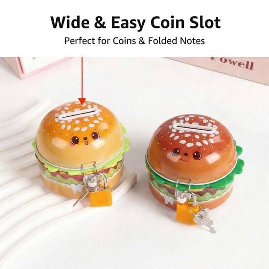 Serve up some savings fun with this delicious-looking Mini Burger Metal Piggy Bank! Designed to look like a yummy cheeseburger with a cute, smiling face, this coin box is an instant favorite for foodies and little savers alike. Despite its compact size, it’s built with a secure locking mechanism to keep coins safe, making it a "tasty" and practical addition to any child’s collection.