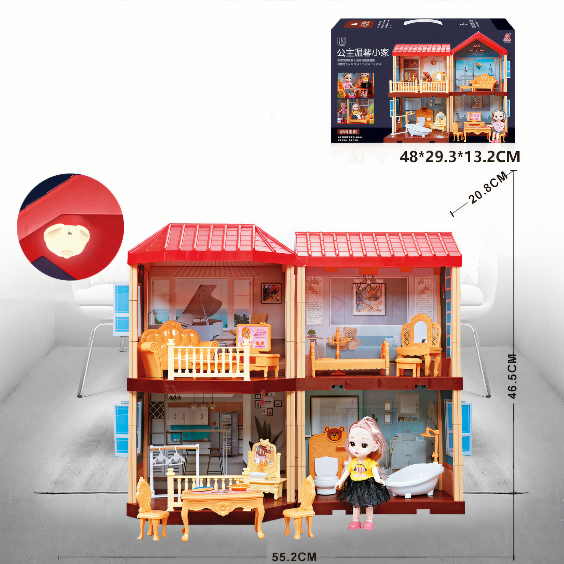 Package Includes: 1 x DIY House Structure (91 Pcs) 1 x Furniture Accessory Pack 1 x Princess Doll LED Light Fixtures