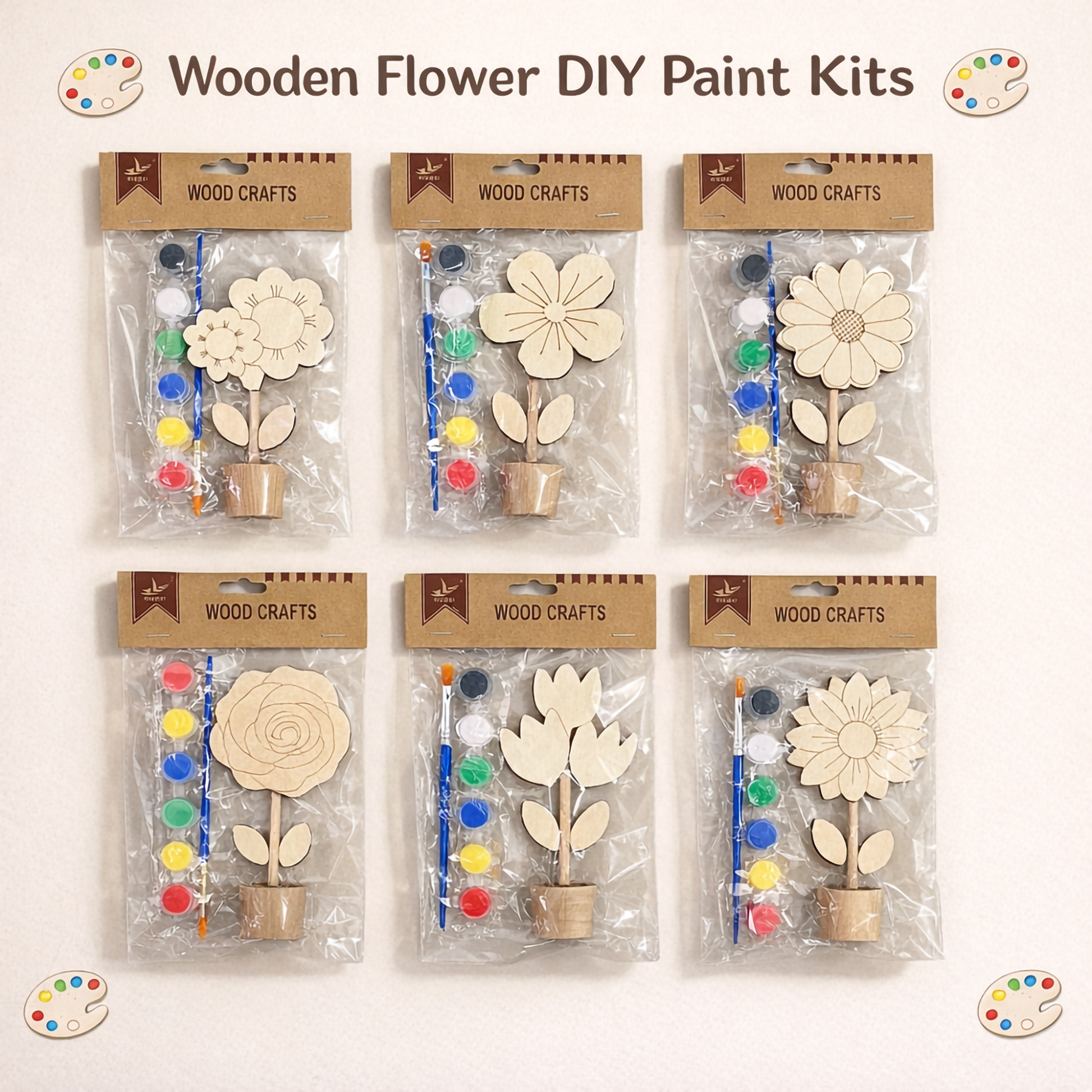 Package Includes: 1x Wooden Flower Cutout, 6x Mini Paint Pots, 1x Painting Brush.