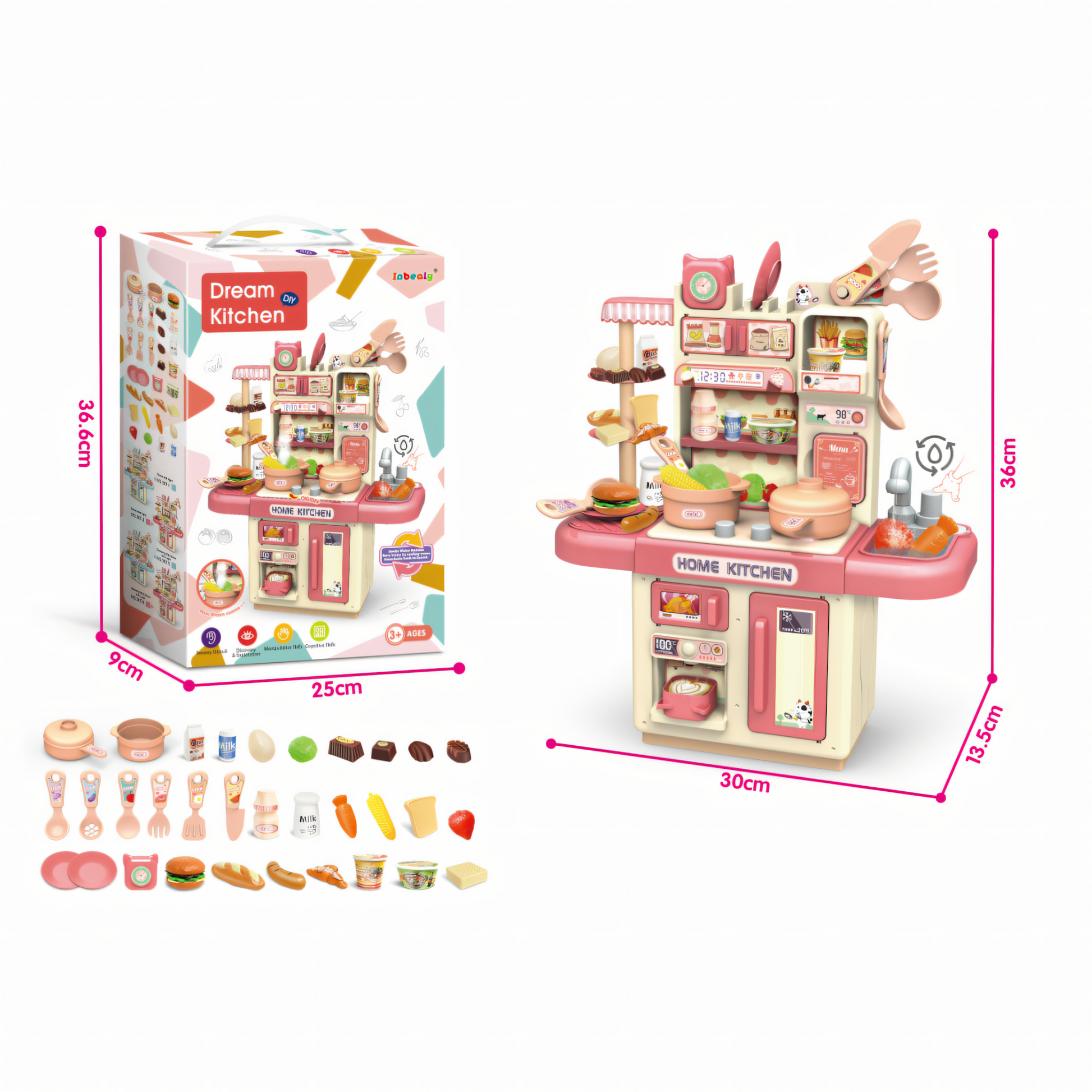 Package Includes: 1 x Kitchen Station Unit 1 x Pot & Pan Set Assorted Play Food (Burger, Bread, Veggies, Sweets) Cutlery & Utensils