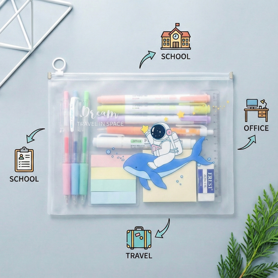 💧 Waterproof & Durable: Made from high-quality frosted plastic (PP/PVC) that is water-resistant, protecting important papers and stationery from spills and moisture.