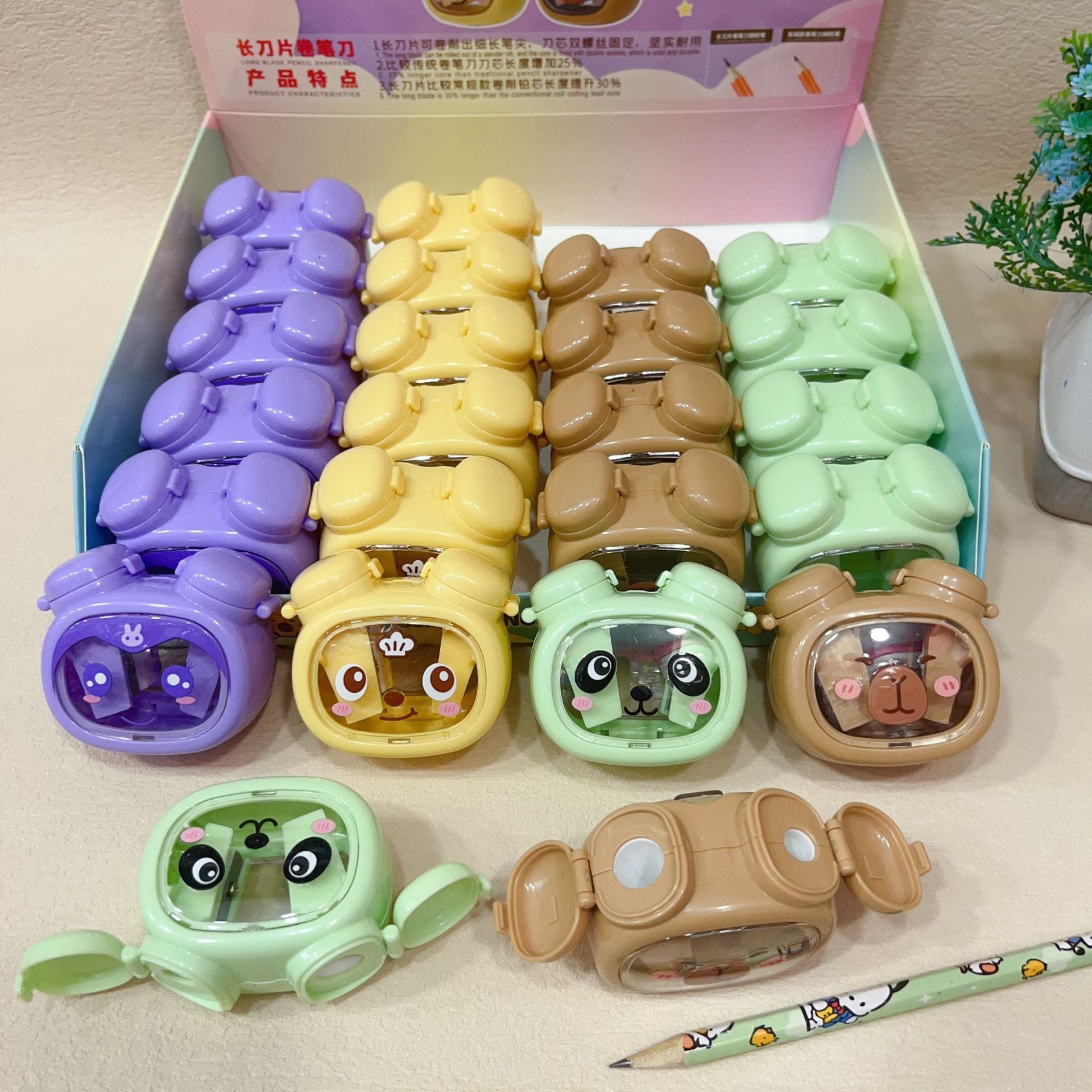 Upgrade your stationery collection with these delightful animal-themed pencil sharpeners featuring a unique long blade mechanism. Designed to create the perfect pencil point, these sharpeners come with playful flip-open ears that double as a protective cover. A functional and fun accessory that adds a touch of joy to every study session, making them a must-have for school kits.