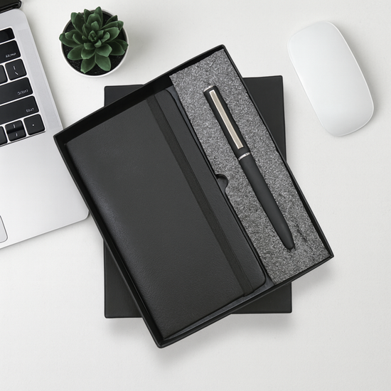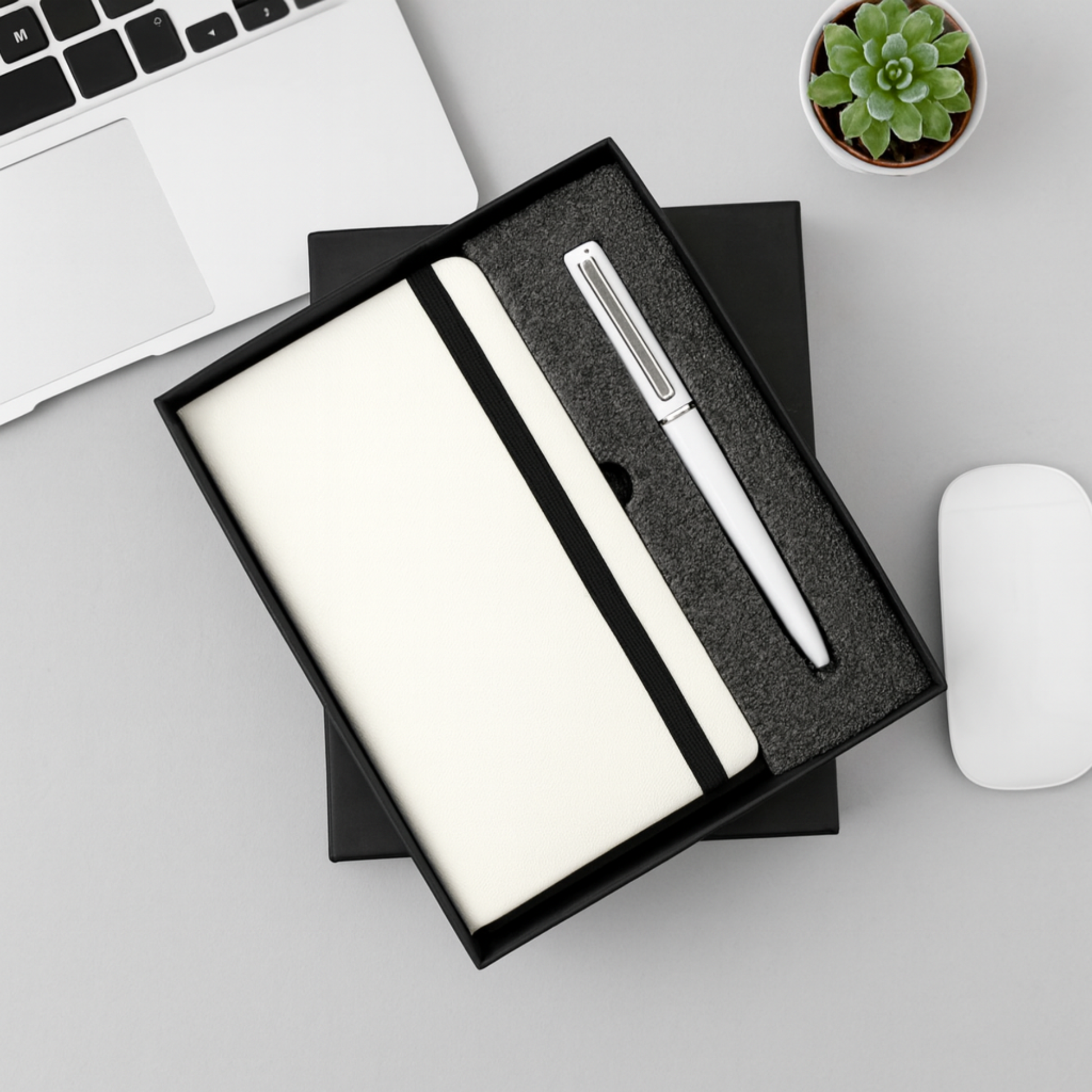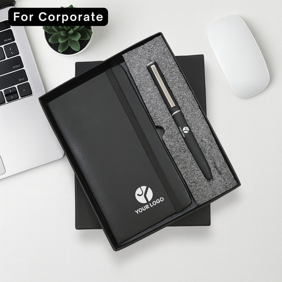 This notebook and pen set offers a clean, professional solution for everyday writing and organized note-taking. Designed with a minimal aesthetic and presented in a structured gift box, it is suitable for corporate gifting, events, and return gift purposes. The option for name or logo customization adds a refined, personal touch.