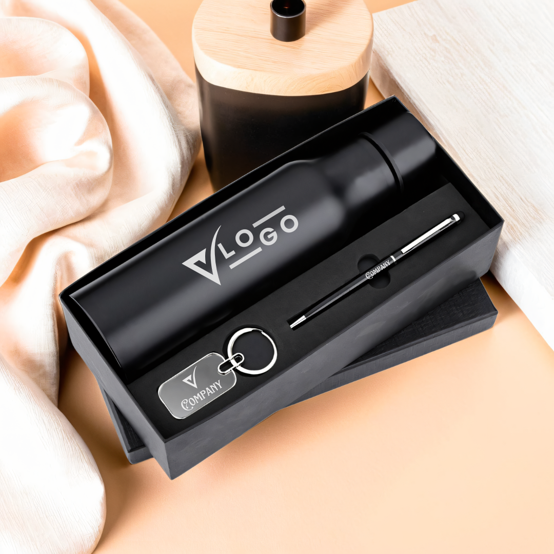 Personalized Corporate Gift Set: Elevate your workday with this stylish and functional gift set. Includes a sleek water bottle, a sophisticated pen, and a personalized keychain. Perfect for the modern professional.