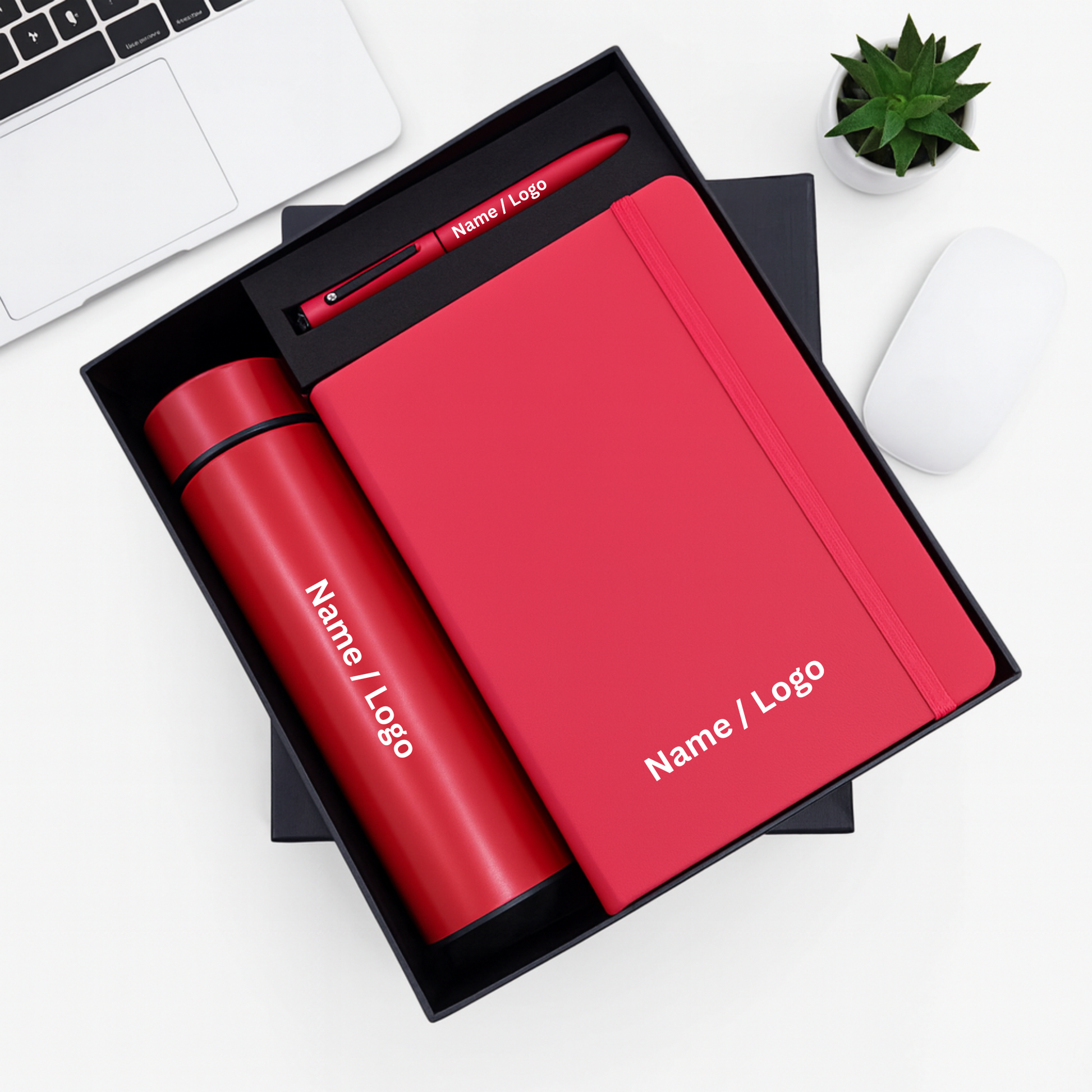 Customization Ready: Designed with ample space on the bottle, pen, and notebook for adding logos or names.