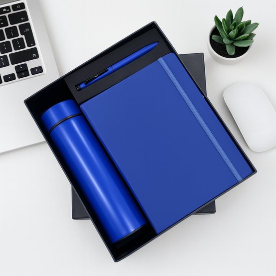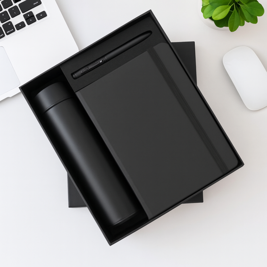 This executive gift set combines functionality and professional style, featuring a matching water bottle, metal pen, and hardcover diary. Presented in a fitted box, it serves as an excellent return gift for corporate seminars, office celebrations, or personal events. The smooth matte finish on all items is designed for easy personalization with names or logos, ensuring a memorable experience for the recipient.