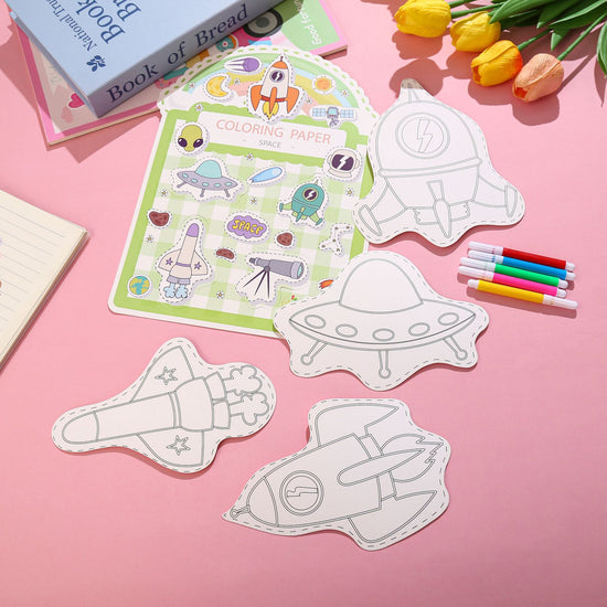 Package Includes: Assorted shaped coloring paper cutouts and 5x mini colored markers (Red, Blue, Green, Yellow, Pink) per set.