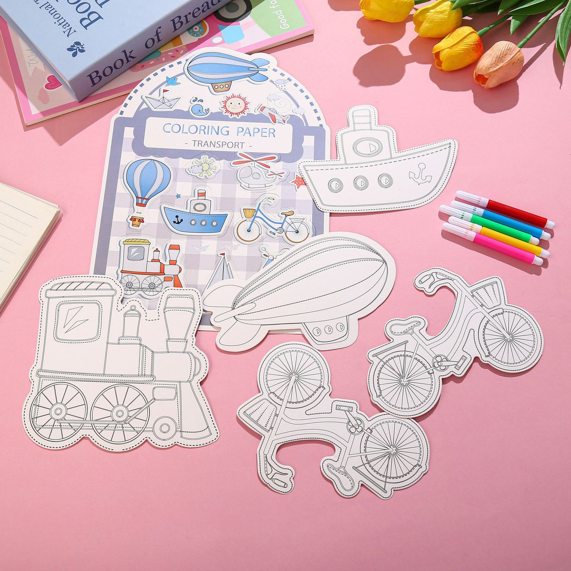 Color & Design: Blank black-and-white outline illustrations ready to be colored. Available in 4 distinct themes (Dinosaur, Butterfly, Space, Transport).