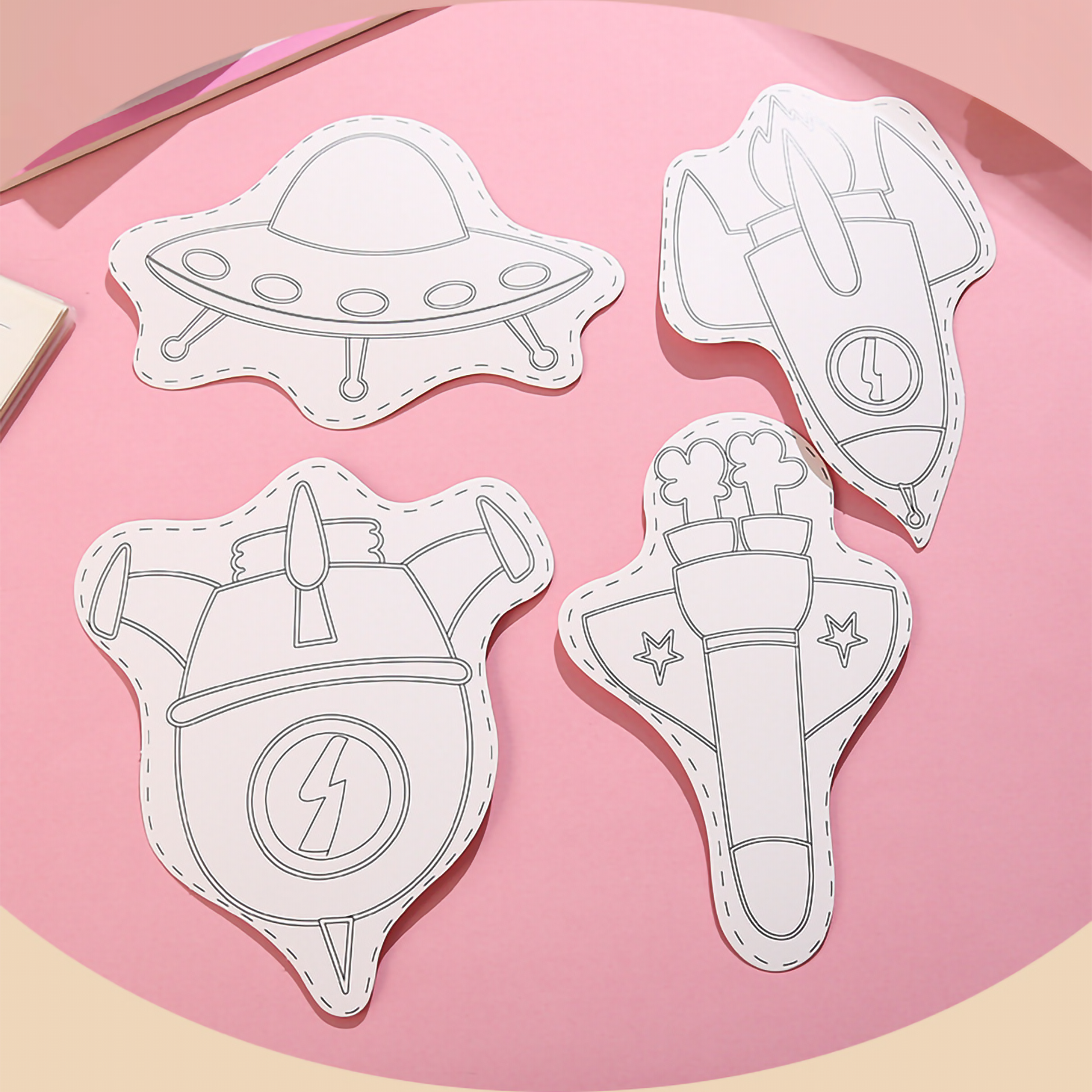 🎨 Ready to Color: Pre-cut, uniquely shaped paper designs featuring fun, kid-friendly bold black outlines.