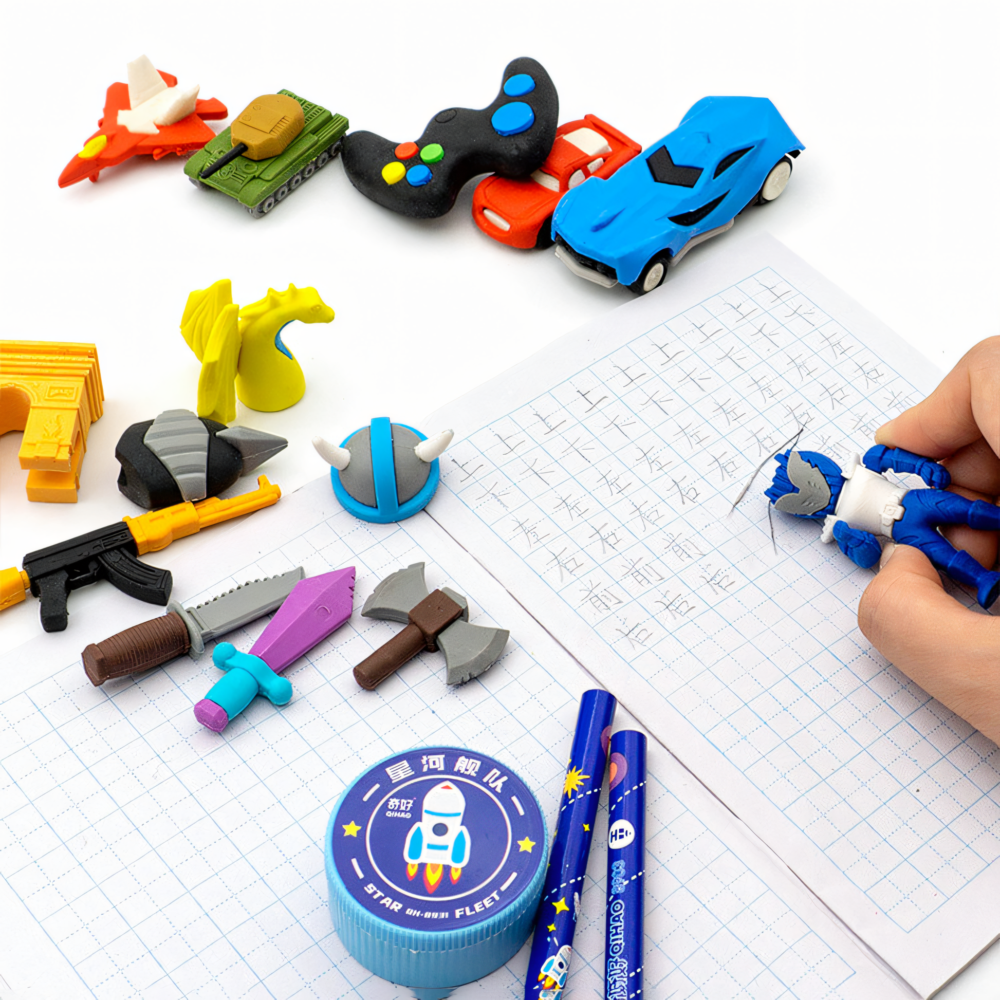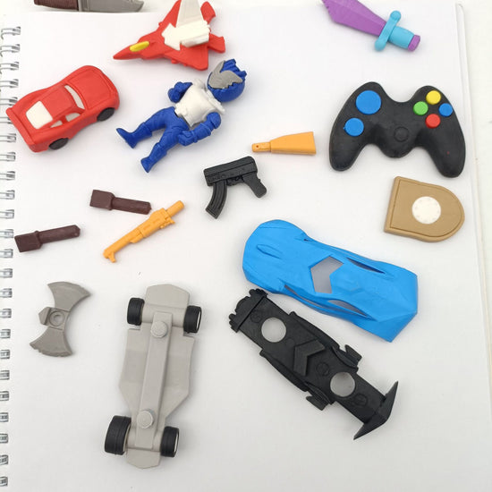 Level up your stationery collection with this massive "Game World" eraser set! Designed for kids who love action and adventure, this kit brings video games to life with a collection of high-quality 3D erasers. Featuring soldiers, combat vehicles, and mythical weapons, these aren't just erasers—they are miniature toys that make homework exciting and creative.