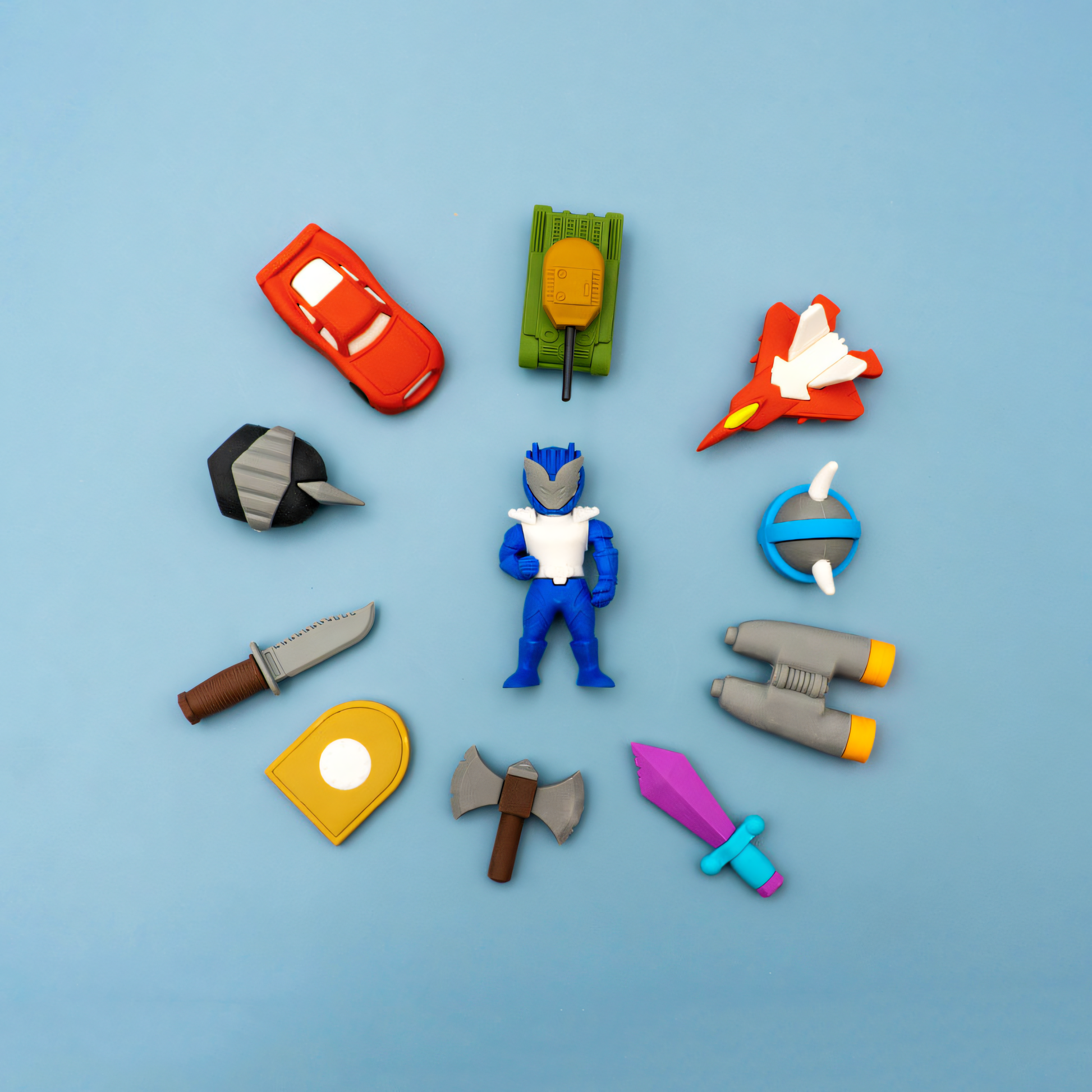 Package Includes: Soldier, Tank, Jet, Car, Weapons (Sword, Axe, Knife), Shield, Helmet, Binoculars, Monument