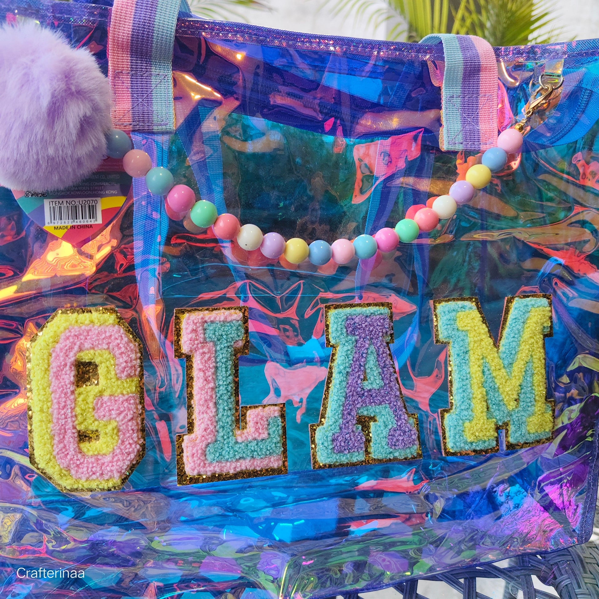 Material: Transparent holographic plastic with fabric letters, plastic beads, and faux fur pompoms.