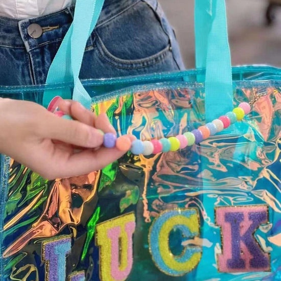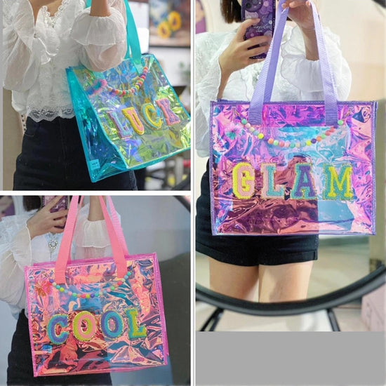 ✨ Holographic Tote Bag – COOL / LUCK / GLAM | Beaded Handle | Trendy Transparent Bag
