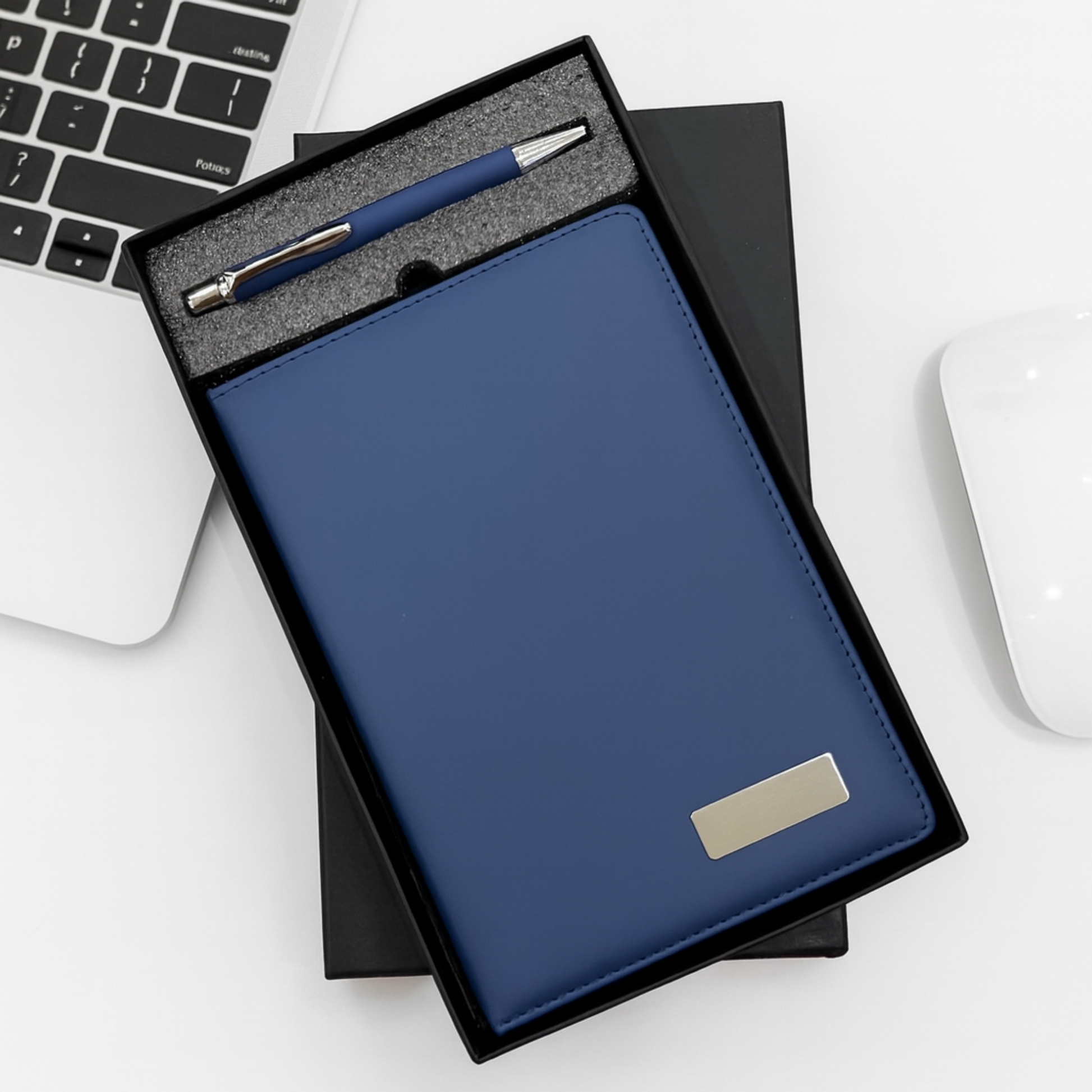 Make a lasting professional impression with this Personalized Diary & Pen Set, the ultimate choice for corporate gifting and employee appreciation. Beautifully presented in a rigid black gift box with custom foam inserts, this set features a high-quality A5 notebook and a matching weighted metal pen. The notebook is crafted with a premium soft-touch cover and a distinctive metal plate for engraving names or logos, while the pen offers a smooth writing experience. Whether for onboarding new hires, thanking clients, or celebrating milestones, this combo delivers sophistication and utility.