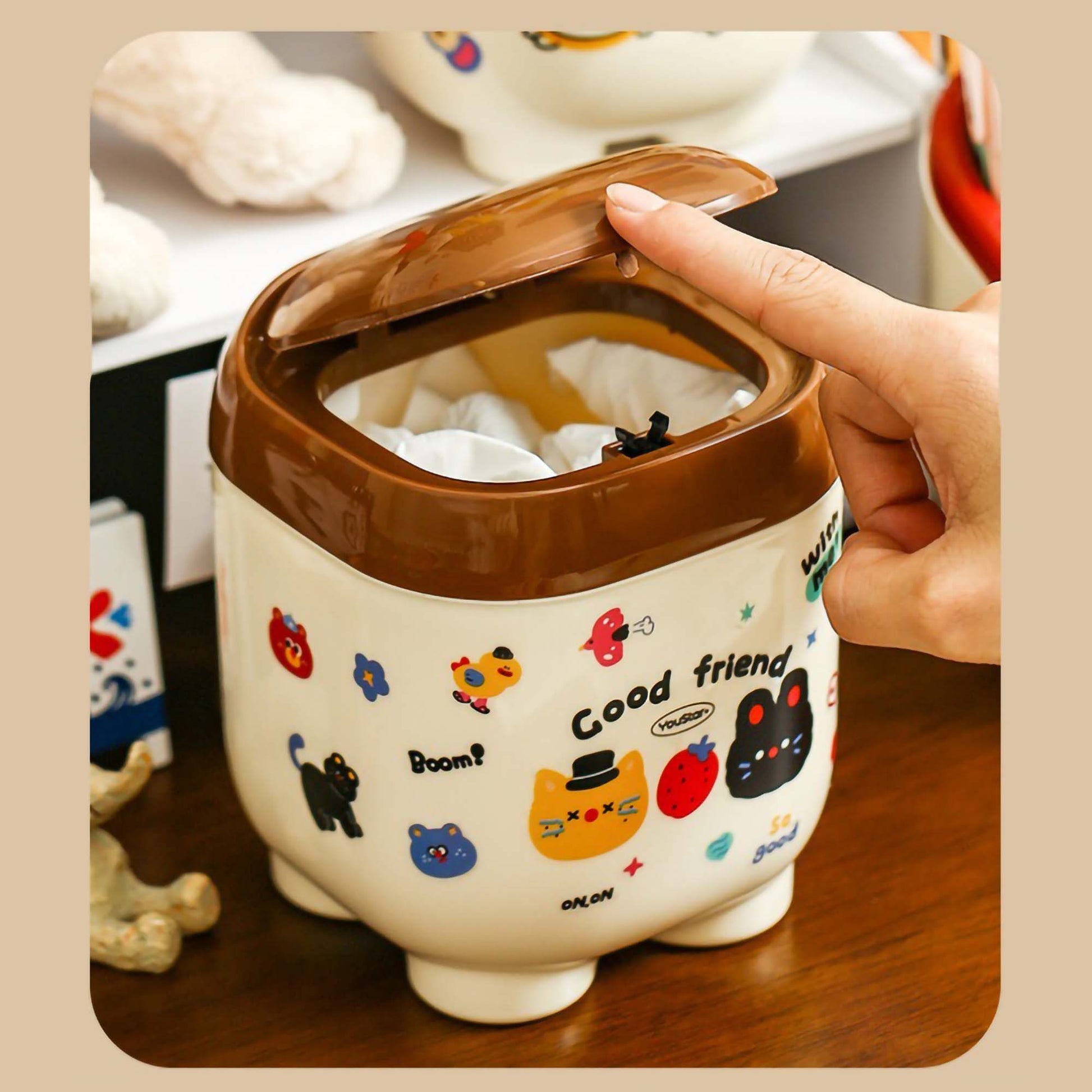 Keep your workspace tidy and adorable with this Mini Desktop Trash Can! Designed to look like a tiny piece of furniture with four stubby legs, this bin features a convenient press-top lid that pops open with a single click. It comes plain but includes a sheet of vibrant cartoon stickers, allowing kids (and adults!) to customize their bin with cute cats, dogs, and fun phrases. It's perfect for holding tissue scraps, pencil shavings, or even storing small stationery items.