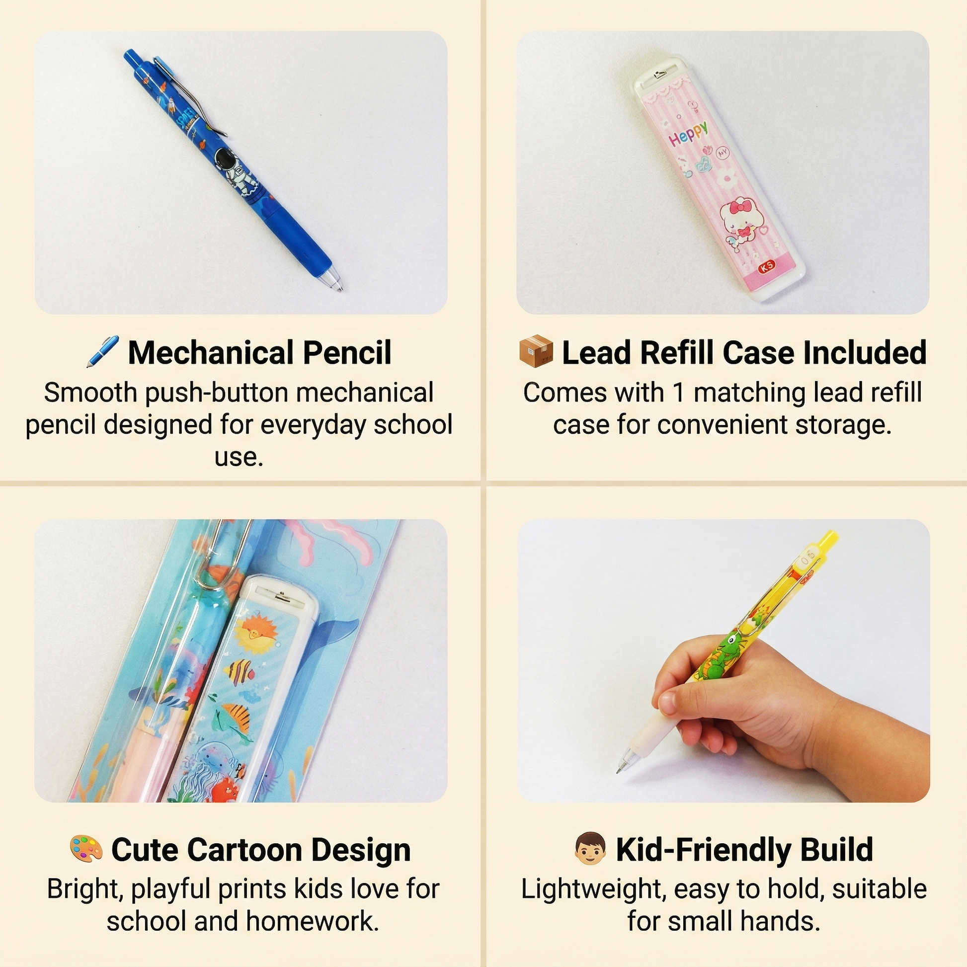 Kids Cartoon Mechanical Pencil Set with Lead Refills – 0.5mm Automatic Pencil with Case