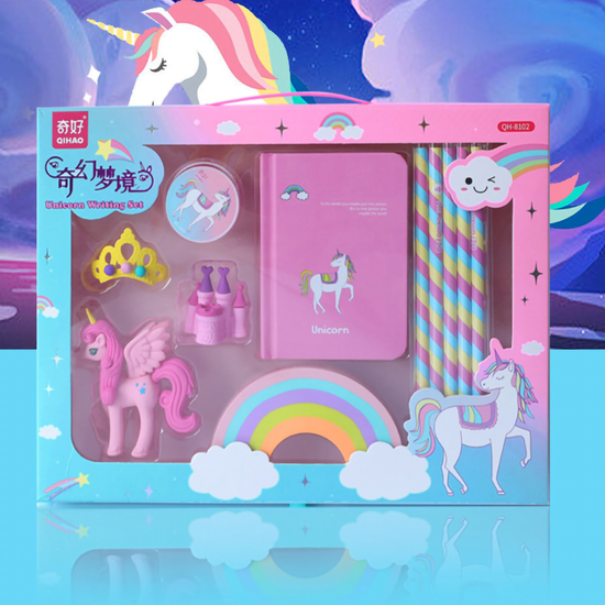 Contents: 1 Notebook ("Unicorn"), 5 Pastel Pencils, 4 Erasers (Unicorn Pony, Castle Towers, Rainbow), 1 Sharpener.