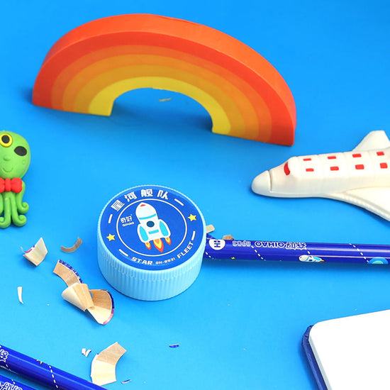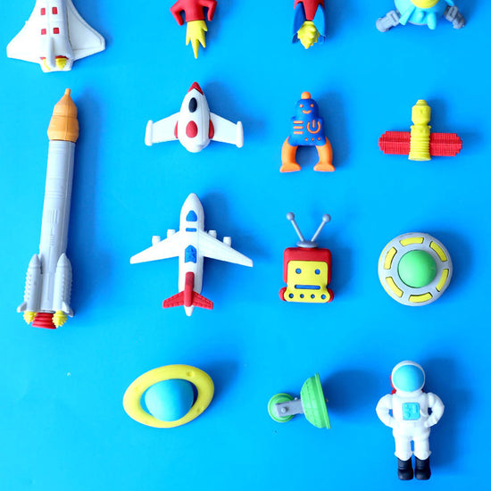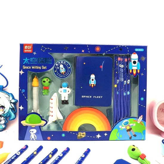 Contents: 1 Notebook ("Space Fleet"), 5 Pencils, 5 Unique Erasers (Astronaut, Alien, Rocket, etc.), 1 Sharpener.