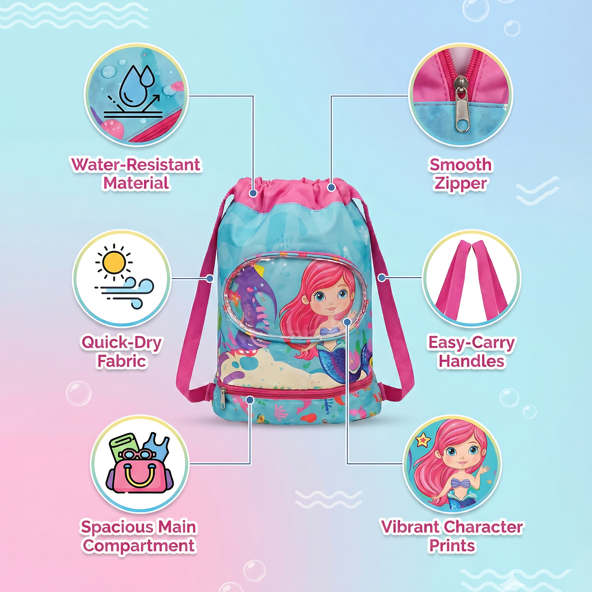 🌊 Perfect Swimming Bag Size (18 Inch) – Large enough to hold swim clothes, towel, goggles, slippers, cap, water bottle & more.