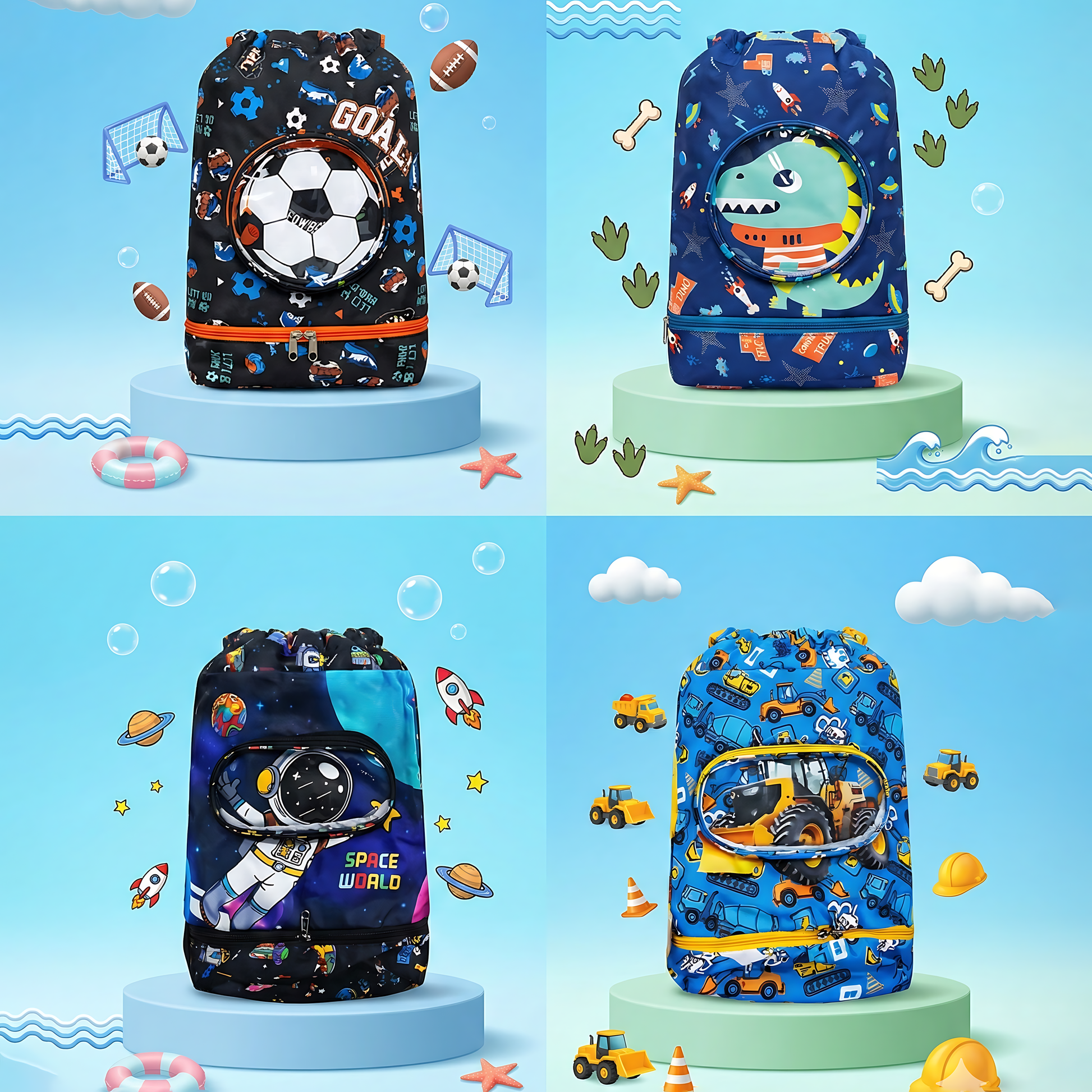 Make pool time extra exciting with these colourful 18-inch Kids Swimming Bags! Designed with adorable boys & girls themes like unicorn, mermaid, astronaut, football, kitty, butterfly and construction trucks, this bag is perfect for carrying swimwear, towels, goggles, slippers and more. Lightweight, waterproof and super spacious—perfect for school swimming classes and weekend pool trips!