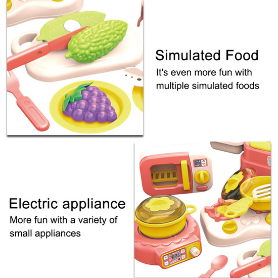 🥗 Play Food & Appliances: Includes colorful play food items like corn, carrots, grapes, and strawberries, plus mini kitchen appliances like a simulation microwave and a dual-burner stove.