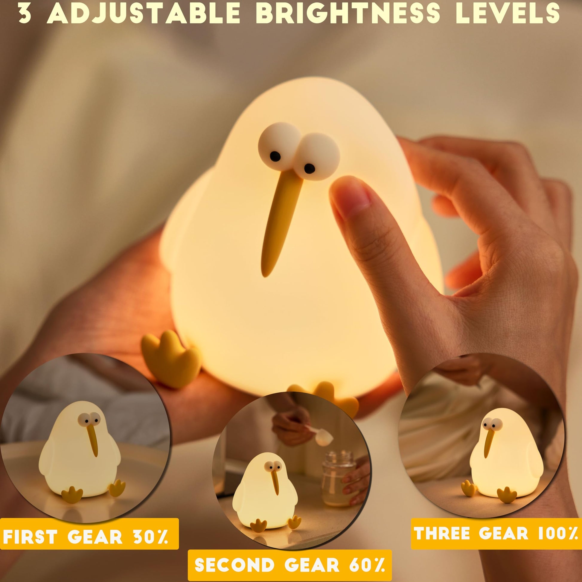 Crafted from ultra-soft, squishy silicone, this lovable bird glows with a gentle warm light that’s perfect for bedtime or relaxation. With three brightness settings, touch control, and a rechargeable battery, it combines playful charm with everyday practicality.