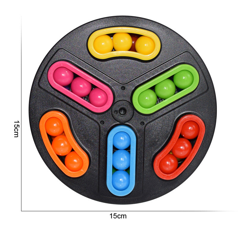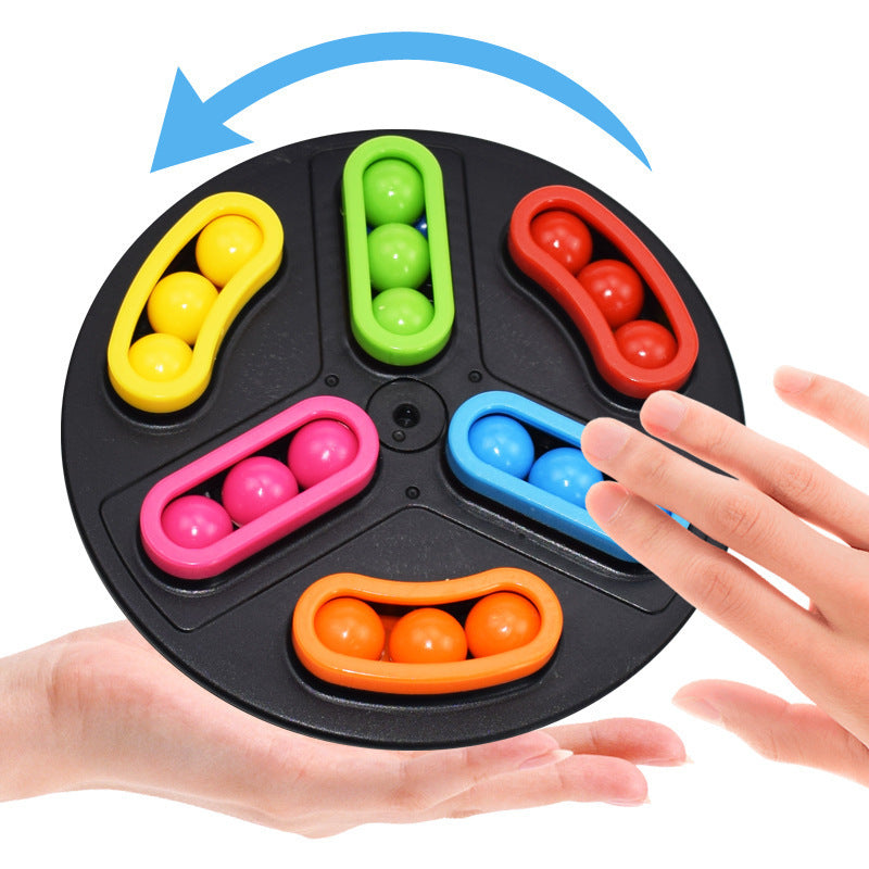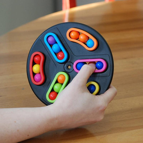 This unique and colorful handheld puzzle helps boost focus, coordination, and problem-solving skills as you twist, spin, and match the colorful marbles on both sides of the wheel.