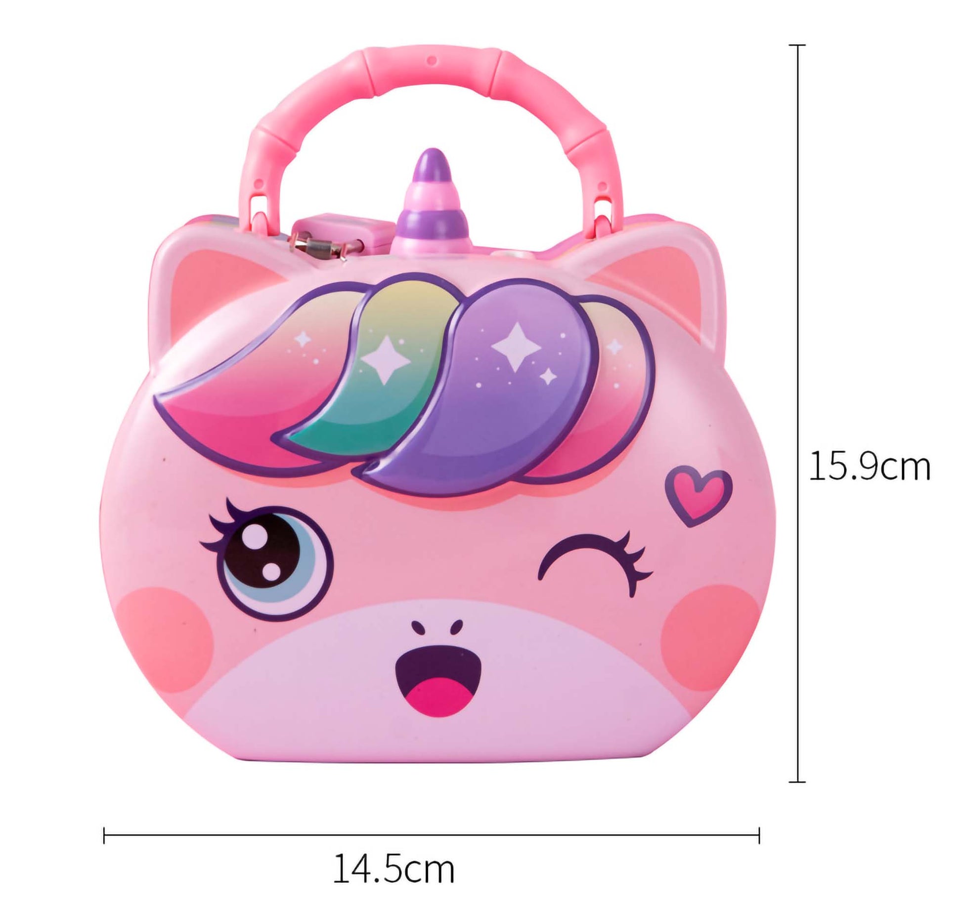 Make saving magical with this enchanting Rainbow Unicorn Metal Piggy Bank! Featuring a dreamy unicorn face with vibrant rainbow hair and a sturdy handle, this money box is designed to delight every little dreamer. It combines secure storage with a cute, portable design, making it the perfect treasure chest for keeping coins, notes, and special keepsakes safe.
