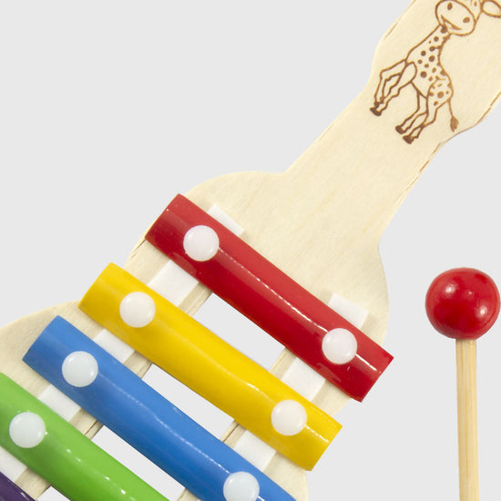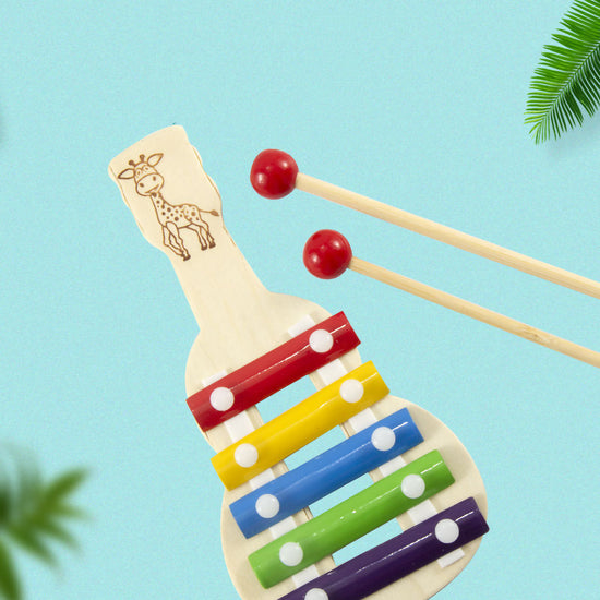 Introduce your little one to the world of music with this charming Mini Wooden Guitar Xylophone! Shaped like a little guitar, this delightful instrument features 5 colorful metal keys that produce sweet, chime-like sounds when struck. It comes with two wooden mallets perfectly sized for small hands, making it a fantastic first instrument to develop rhythm, auditory skills, and hand-eye coordination.