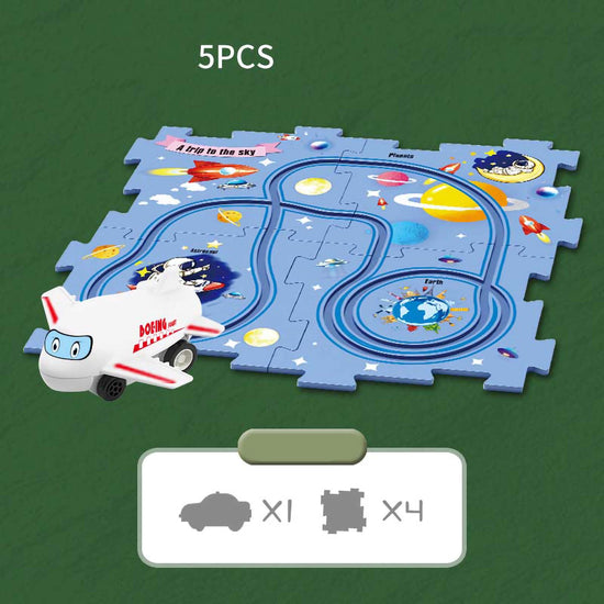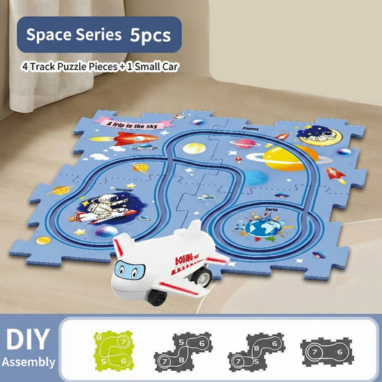 Launch into a mini galactic adventure with this 5-Piece Space Puzzle Rail Set! This compact DIY playset features 4 interlocking puzzle tiles that form a grooved track for the included Electric Airplane to navigate. Illustrated with colorful planets, astronauts, and rockets, it’s a fun and educational way for toddlers to practice logic and building skills while watching their little jet zoom around the "galaxy."