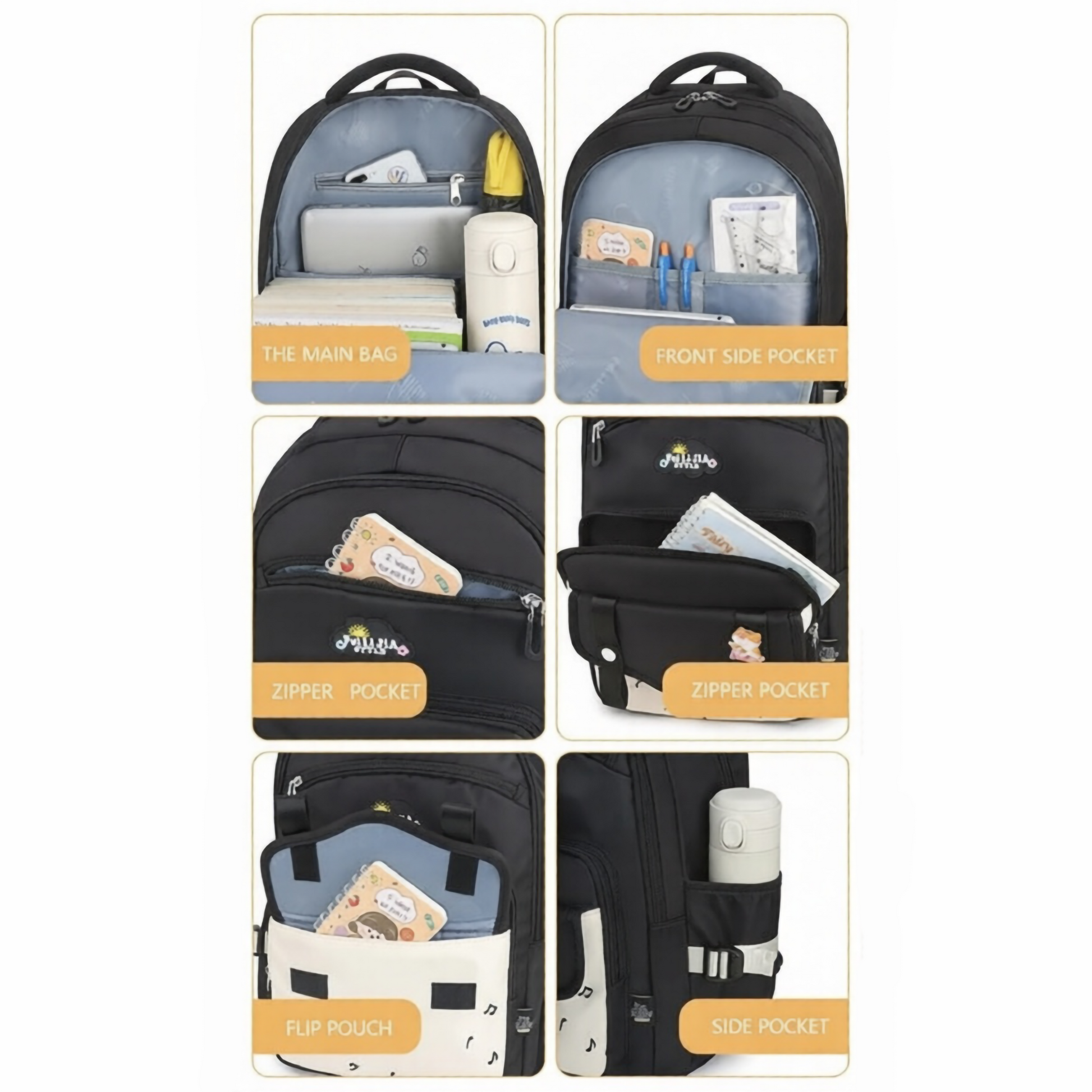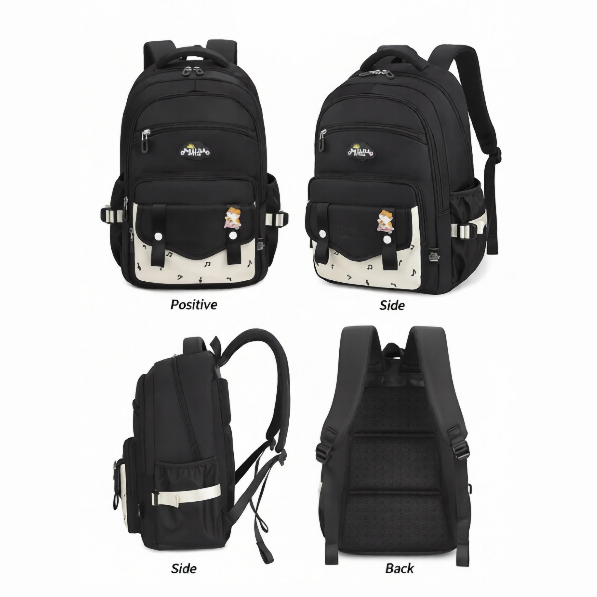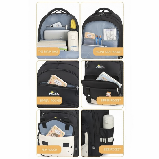 🎨 Color & Design: Available in Black, Light Grey, and Pink. Features a sleek, modern design with a patterned/color-blocked front flip pouch and cute decorative badges.