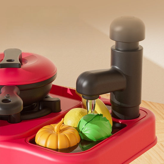 💧 Circulating Water Faucet: Equipped with a working tap that pumps water continuously, allowing kids to wash play food and dishes.