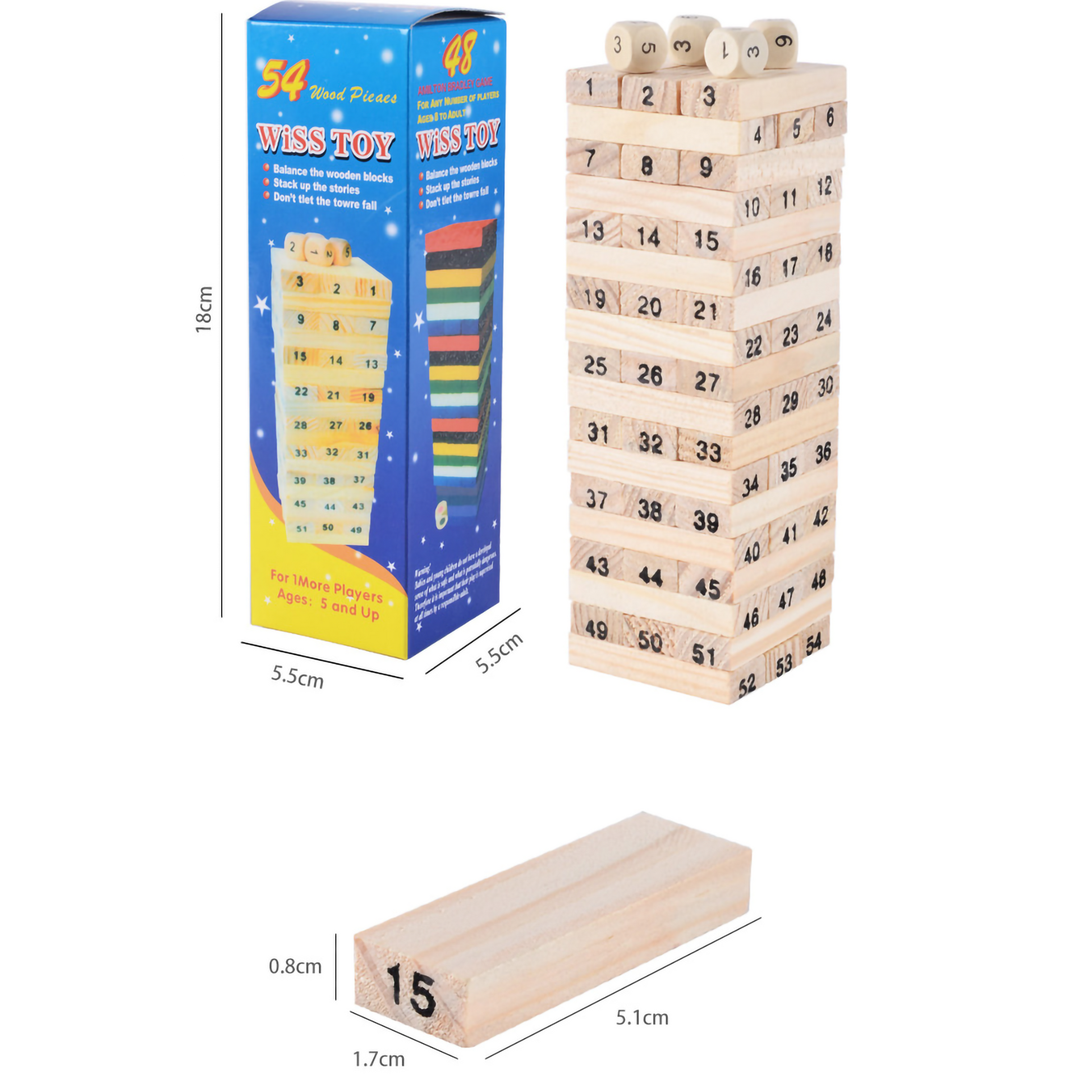 Package Includes: 54 x Numbered Wooden Blocks, Dice.
