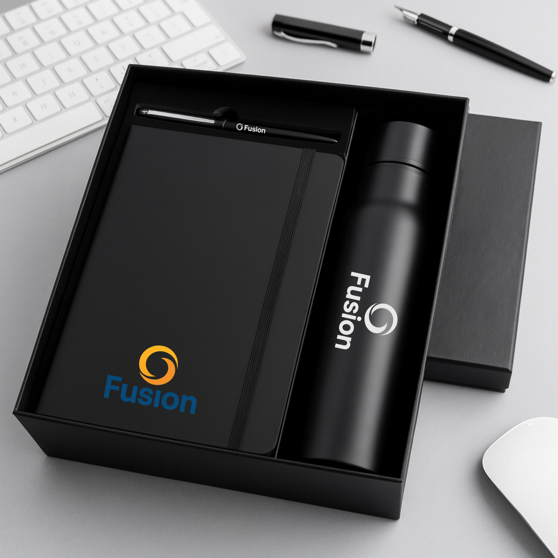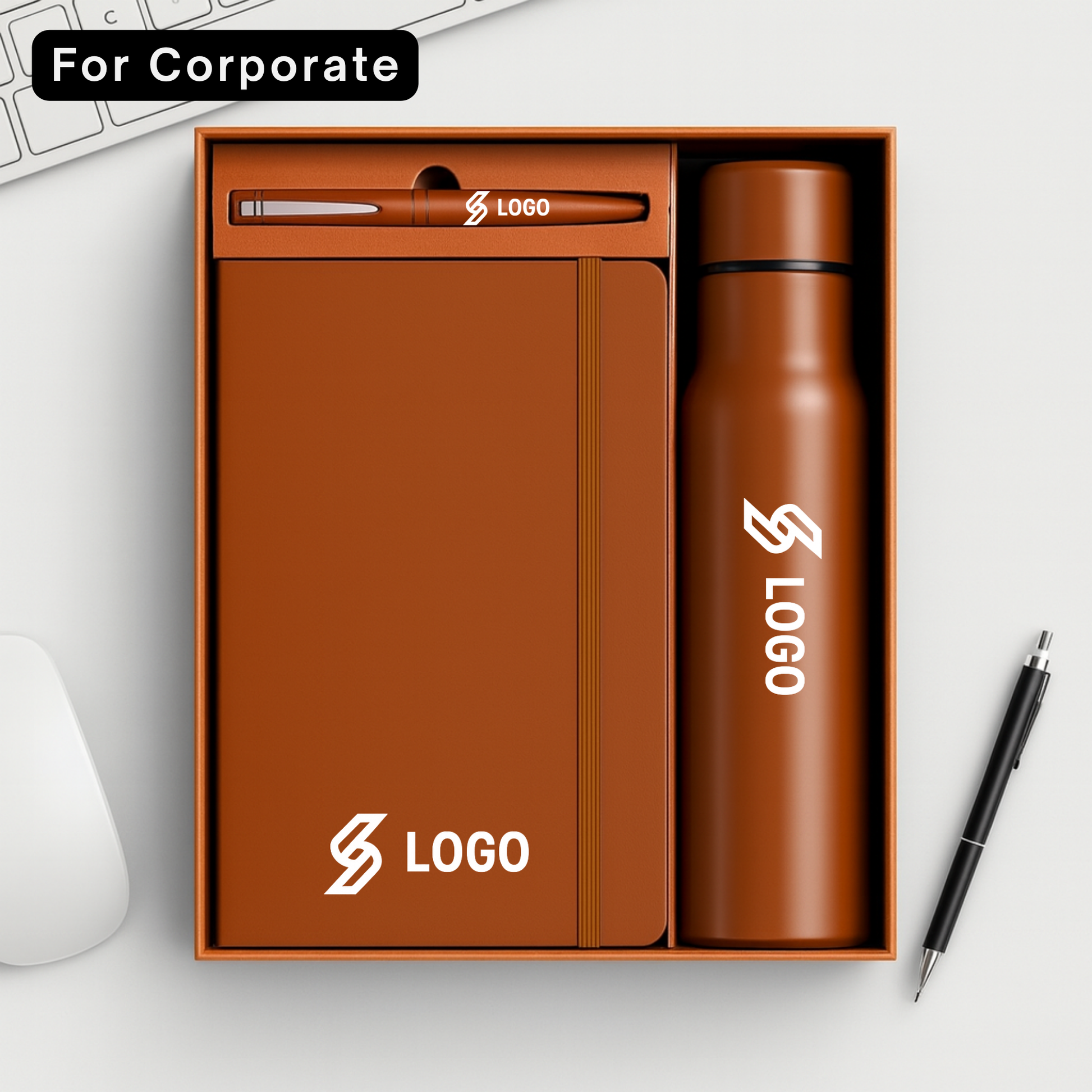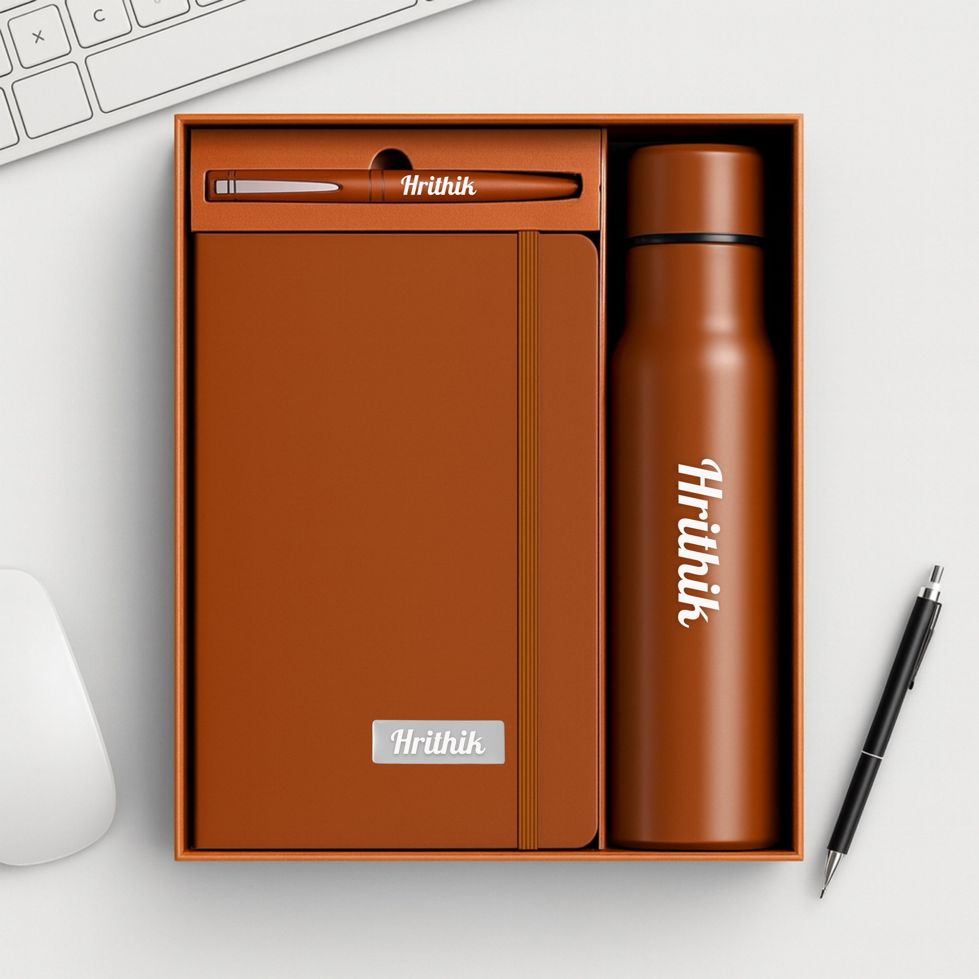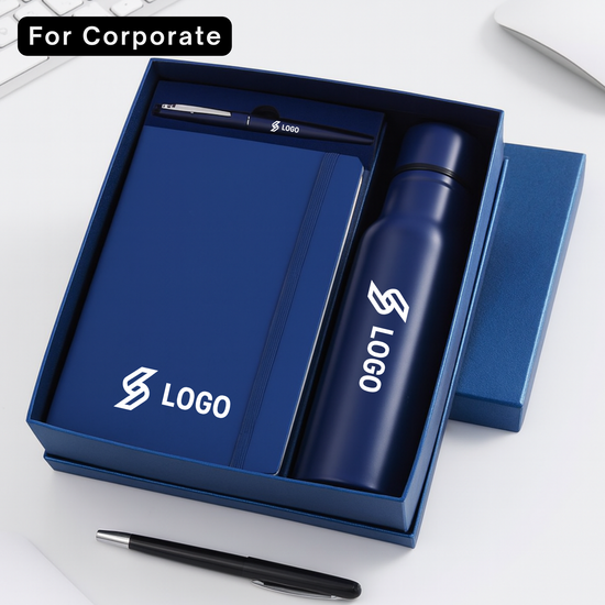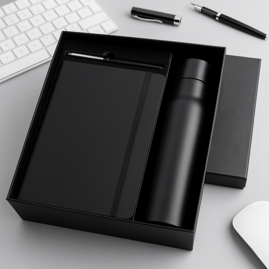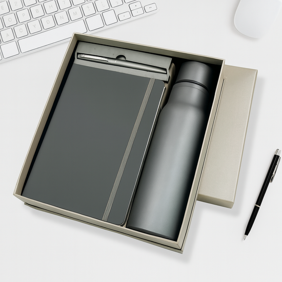 One Set. Three Essentials. This premium gift set is the ultimate corporate starter pack, combining daily utility with professional elegance. The set features a classic A5 diary, a sleek metal pen, and a vacuum-insulated bottle, all house in a luxurious rigid gift box. Designed for comprehensive branding, every item in the box can be customized with a name or logo, making it the perfect choice for employee onboarding, premium client gifting, and festive corporate rewards.