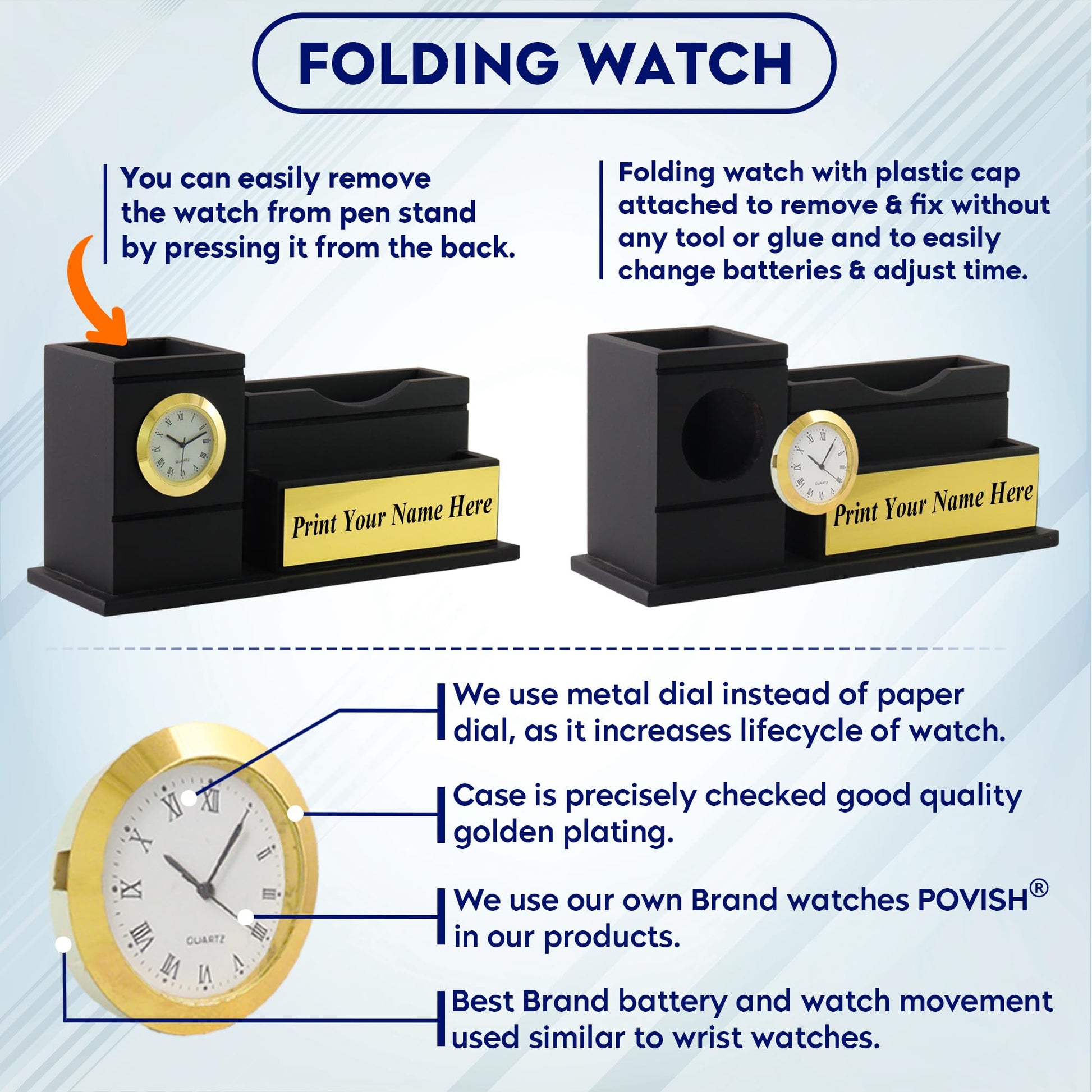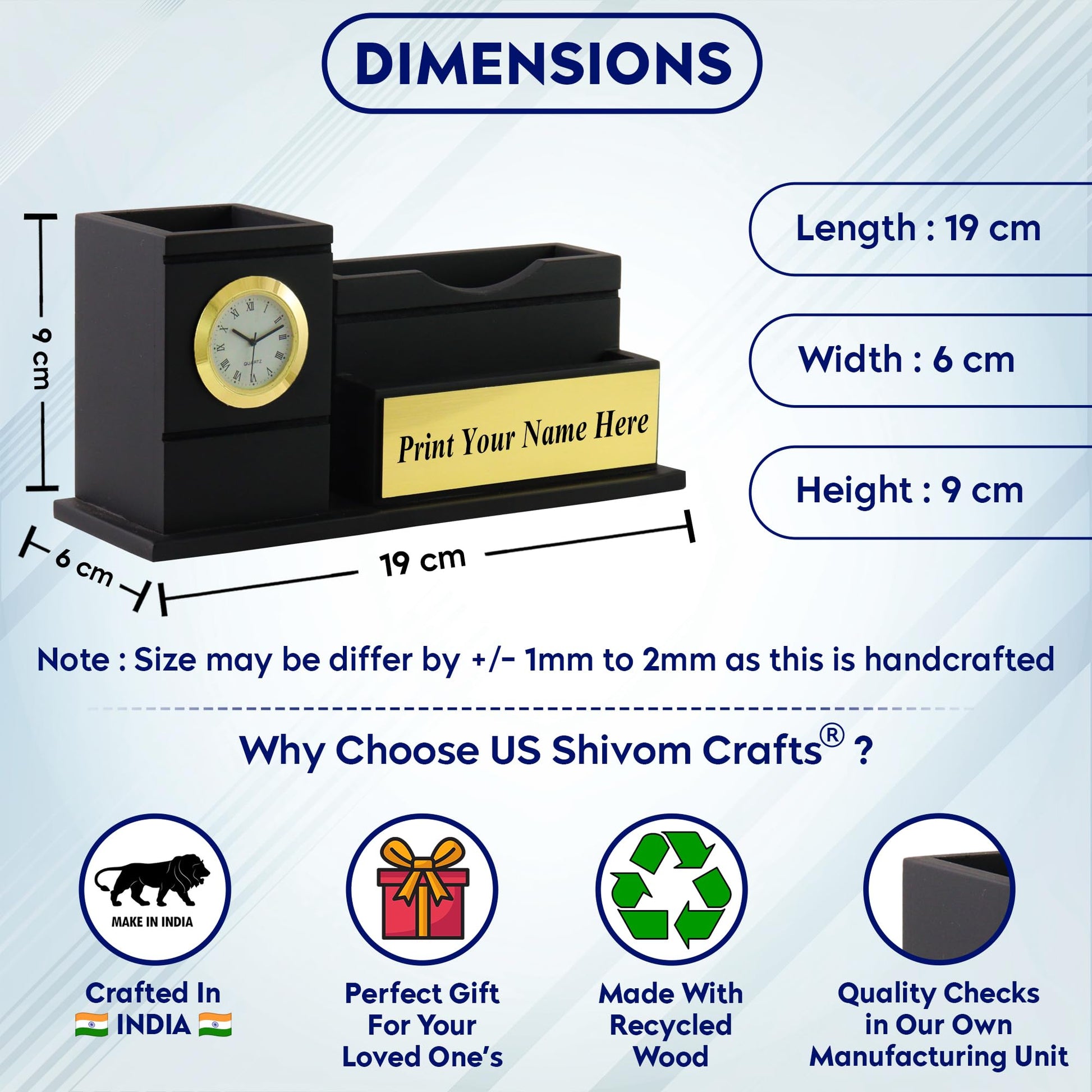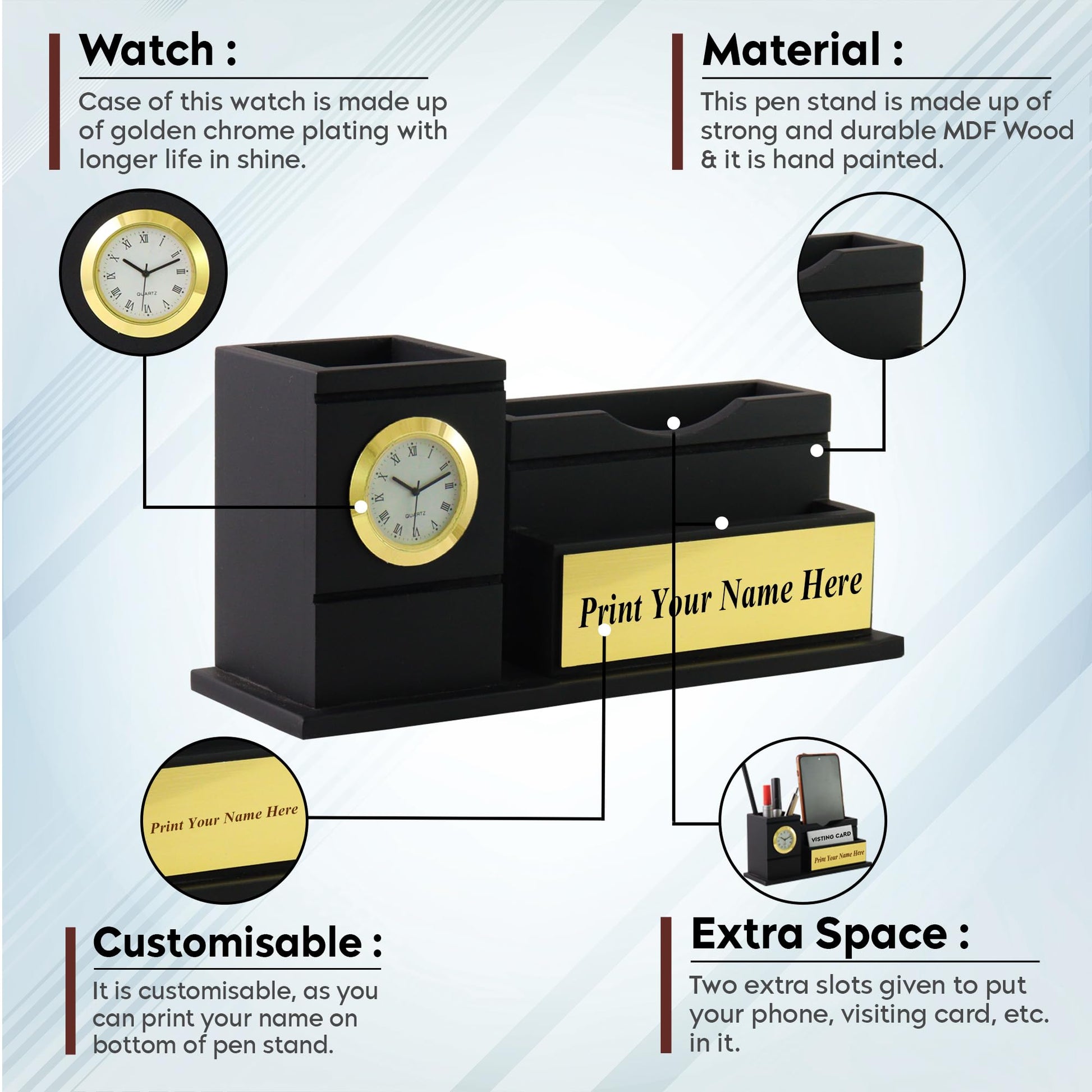 Multi-Functional: Features a built-in clock, a spacious pen holder, and a mobile stand for all your essential items. ⏰🖊️📱