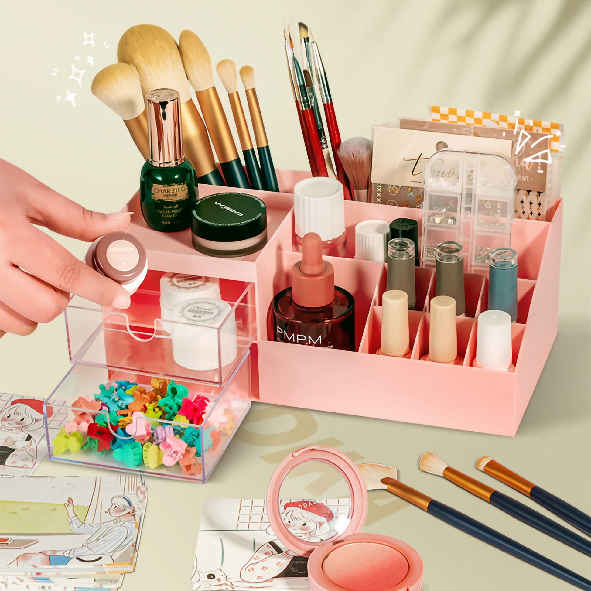 🗄️ Smart Multi-Zone Storage: Designed with 2 transparent pull-out drawers for small treasures and 6+ open compartments to hold pens, brushes, and lotions upright.