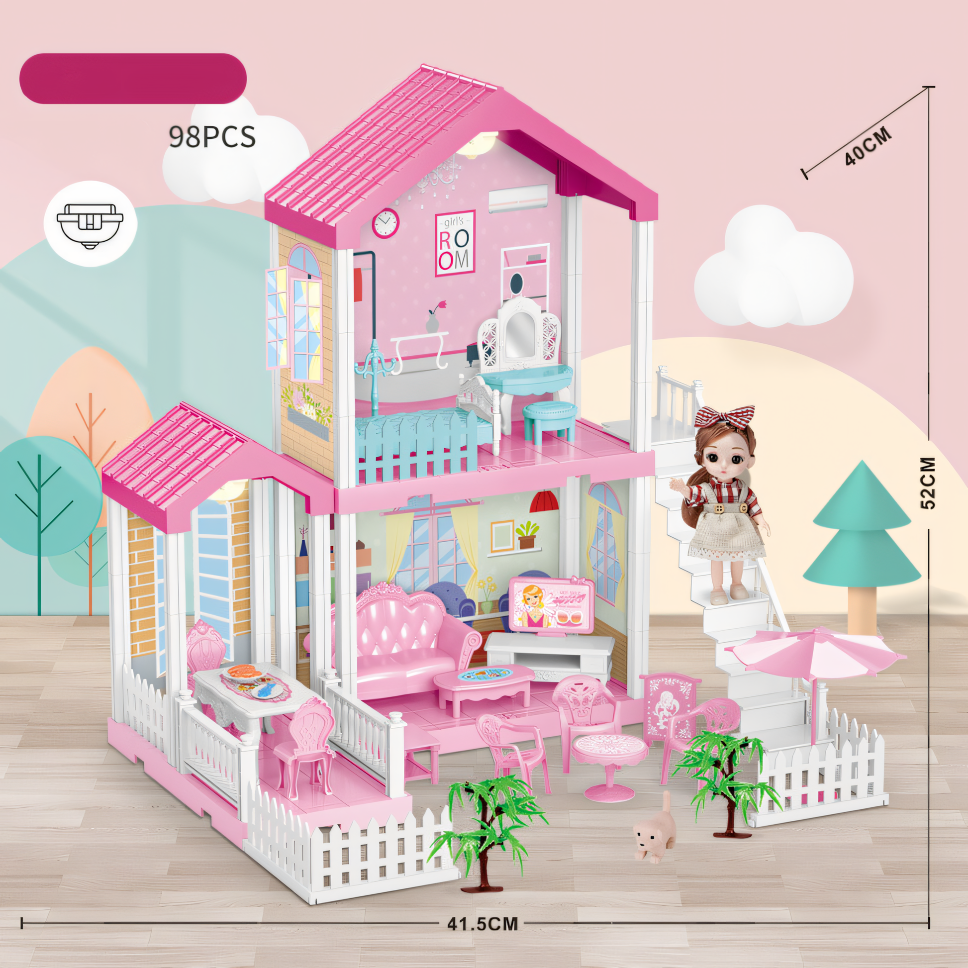 🛋️ Fully Furnished: Comes packed with cute furniture and accessories including a bed, vanity table, sofa, coffee table, chairs, garden umbrella, and white picket fences.