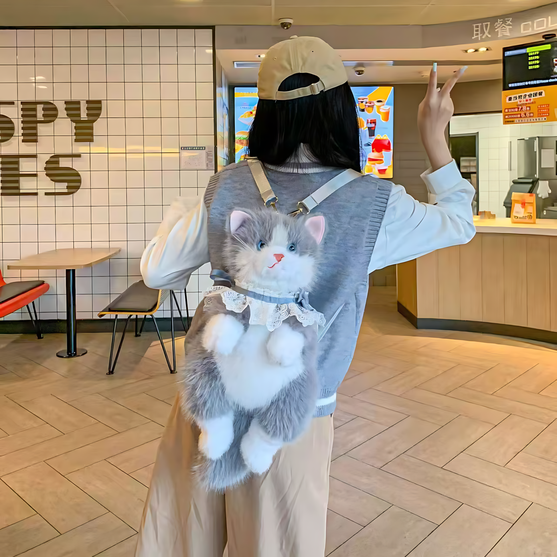 Realistic Ragdoll Cat Plush Backpack – Fluffy Stuffed Animal Bag with Lace Collar