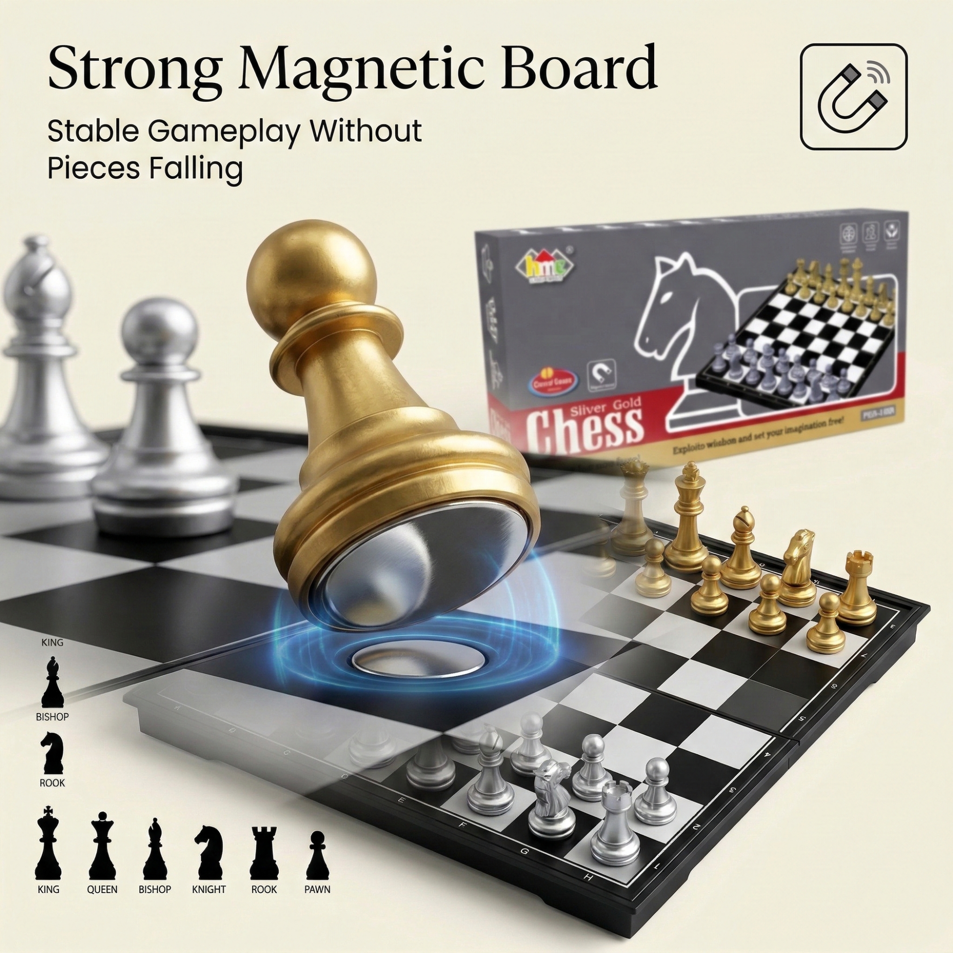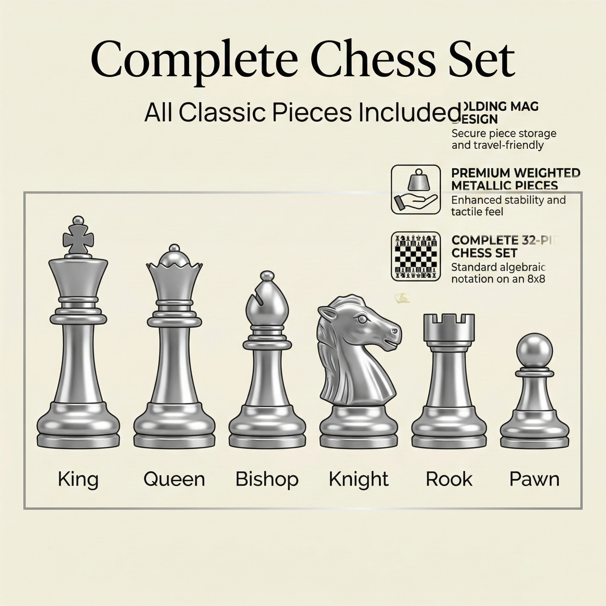 Package Includes: 1x Folding Magnetic Chess Board and 32x Silver and Gold Magnetic Chess Pieces.