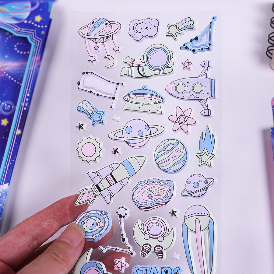 Explore the stars with the Kawaii Space Adventure 3D Luminous Sticker Set!